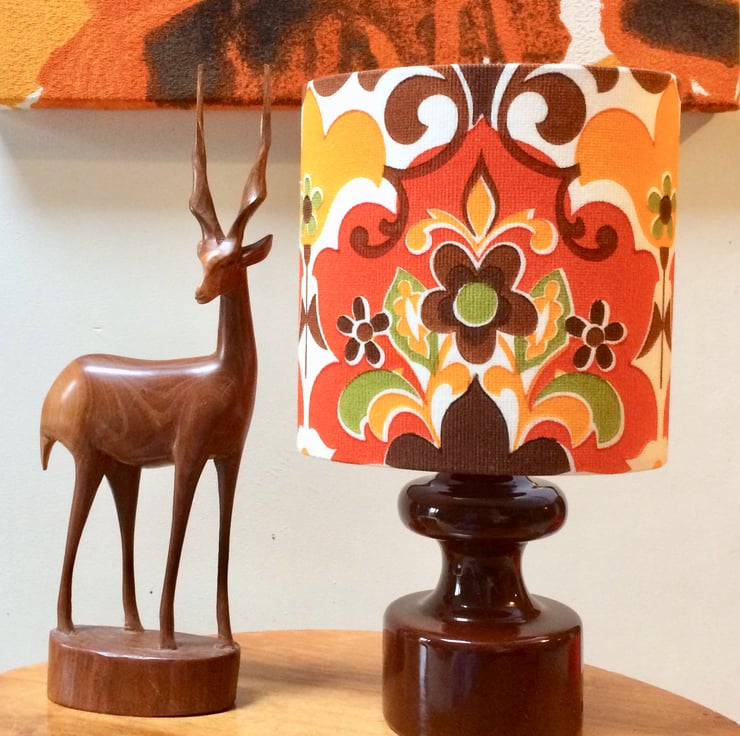 Funky Scandi Style Citrus Floral 60s 70s Vintage Fabric Lampshade option - an bright fabric for a lampshade in a modern, vintage or retro home. A striking floral design in orange, yellow, brown and green design .