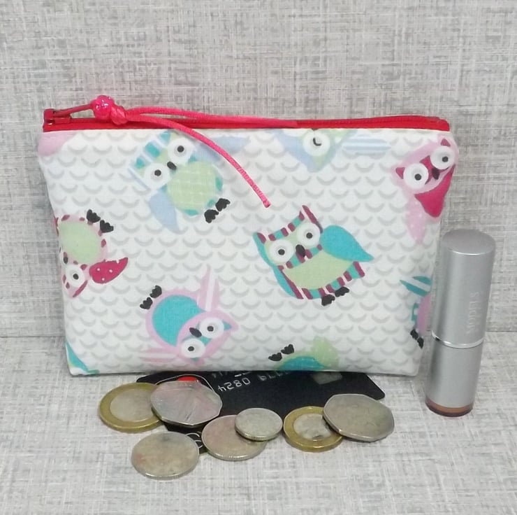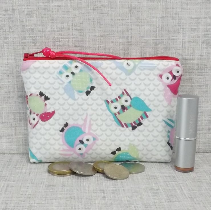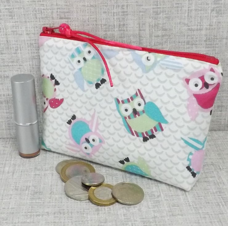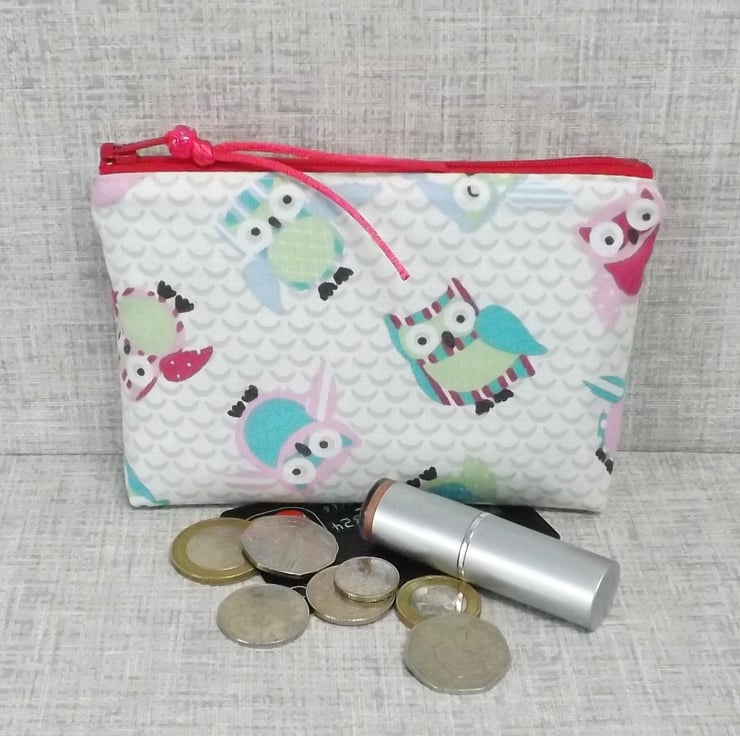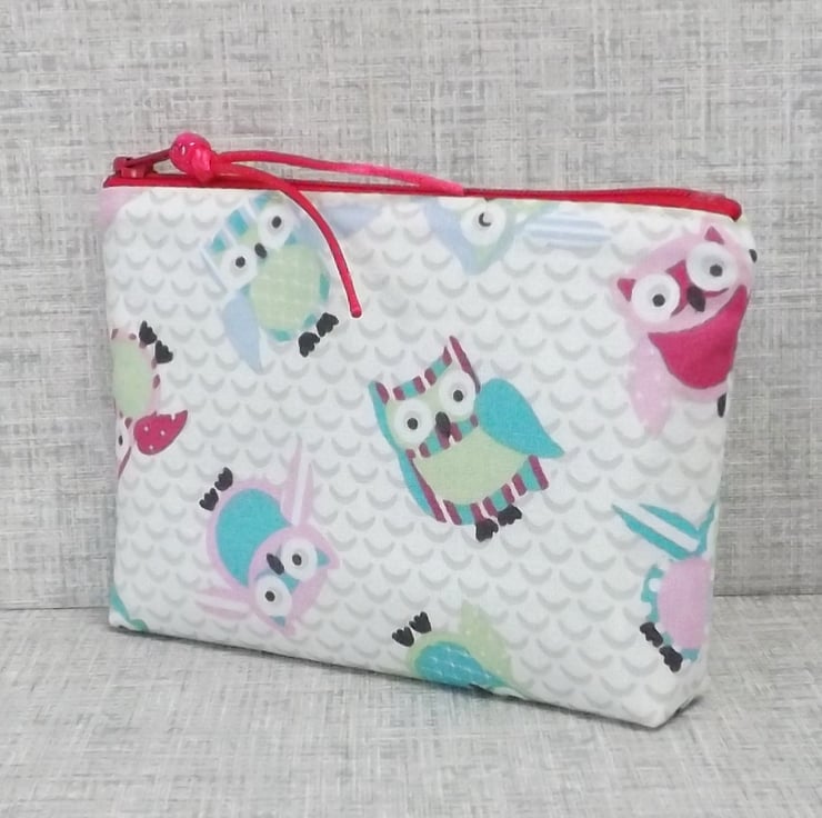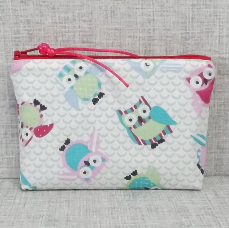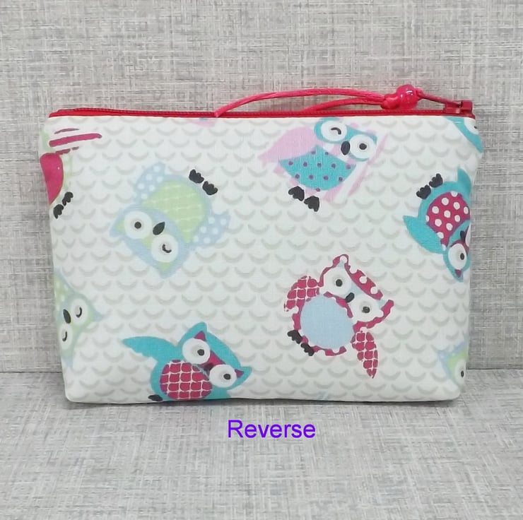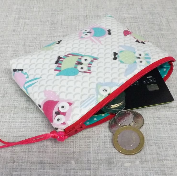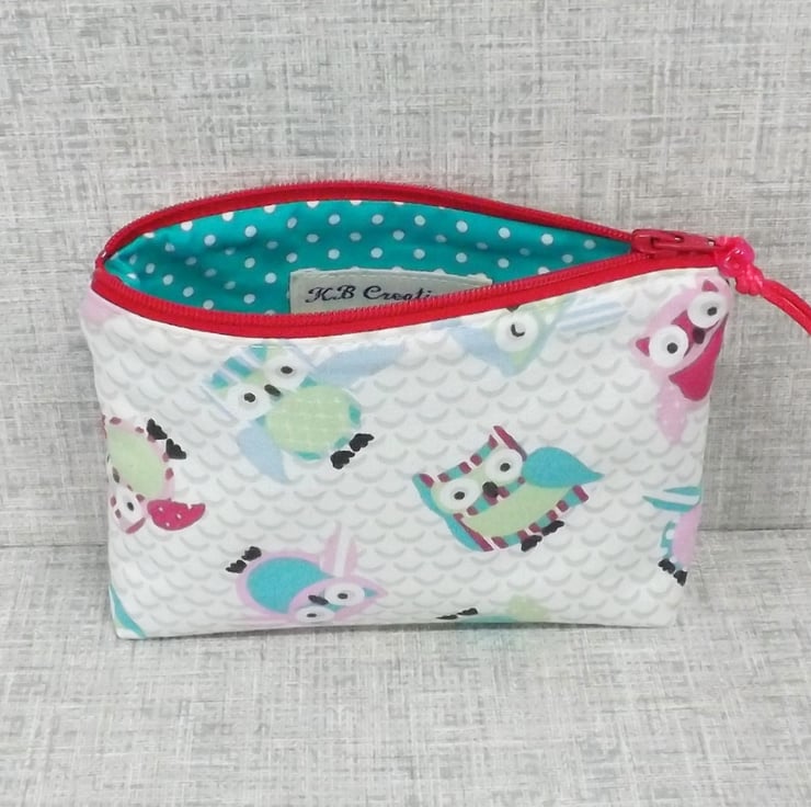 The main fabric has an owl design in shades of pink, green & turquoise on a white/taupe patterned background. The lining is a turquoise cotton with white spots.