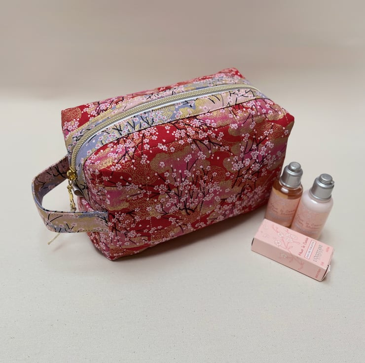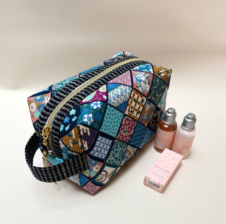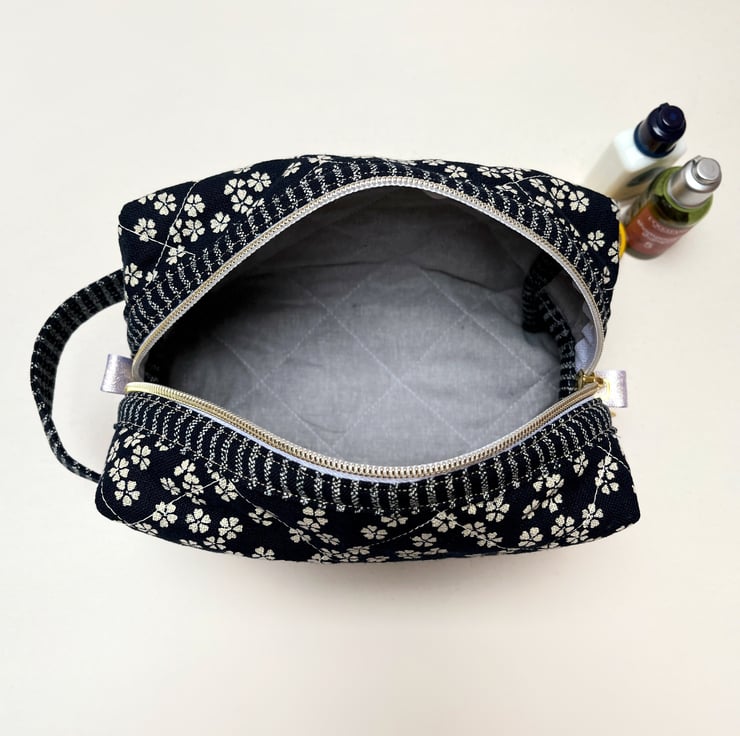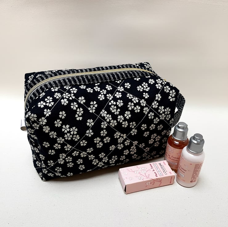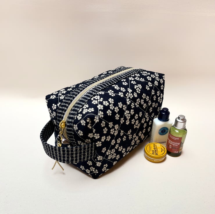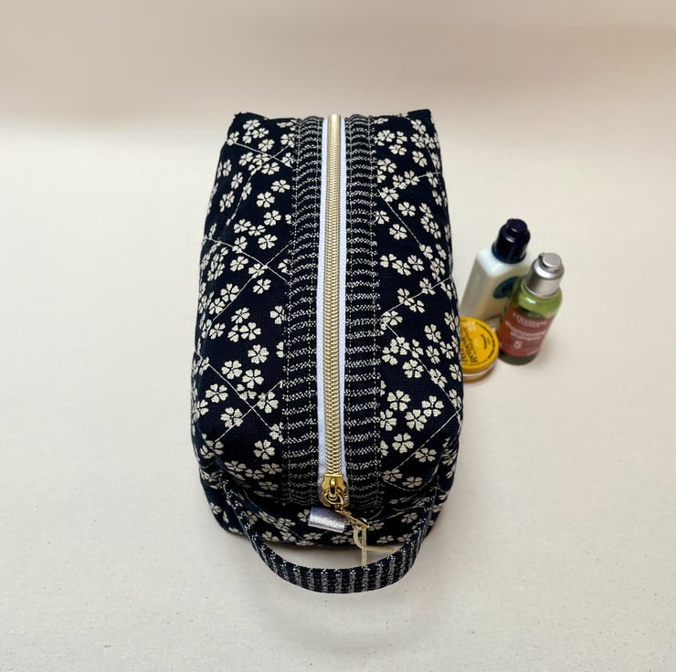 A timeless Japanese indigo fabric with cream blossoms has been selected to craft this cosmetic bag or wash bag with a gold metal donut zip pull. The cotton fabric feels like linen to touch and becomes softer the more it is used.
