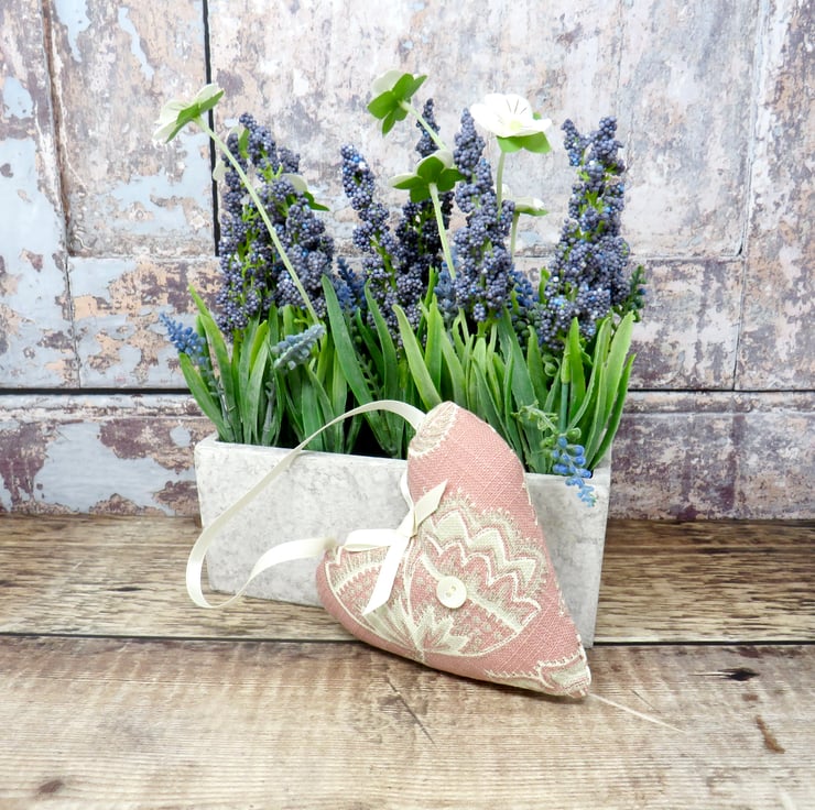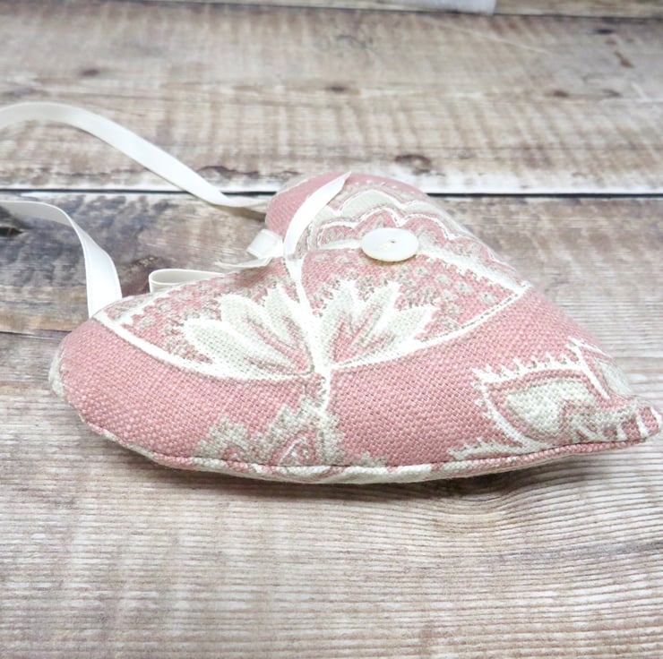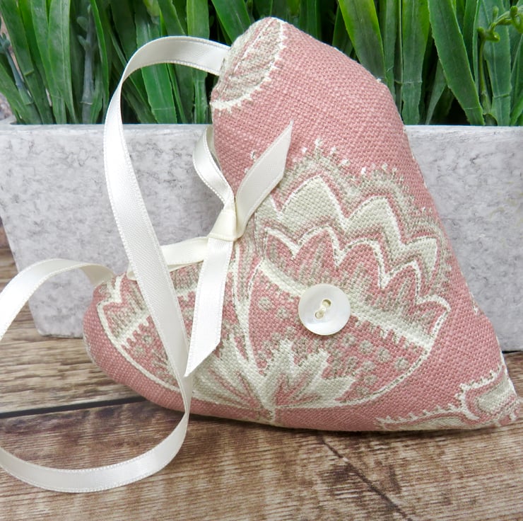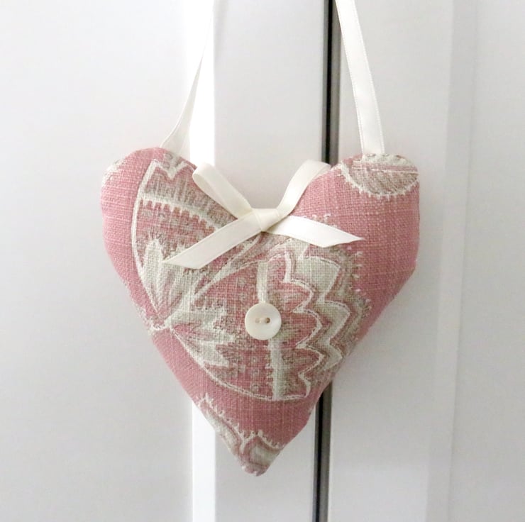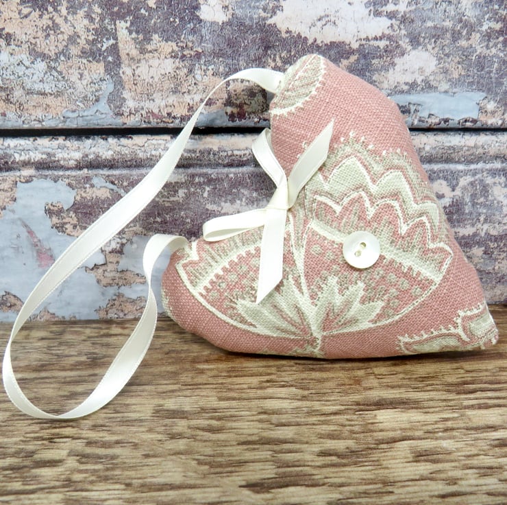 A pretty lavender scented heart in a pink and white cotton print. It has an ivory satin bow and hanging loop, and a tiny white pearlised button at the centre. The heart measures approximately 11 cm x 11 cm (4 3/8" x 4 3/8") at it's widest points, and is filled with wadding and dried Lavender from Provence. Use to decorate your home, hang it on a drawer or door knob or on a hanger in the wardrobe or place it in your lingerie drawer to give your clothes a lovely fragrance.