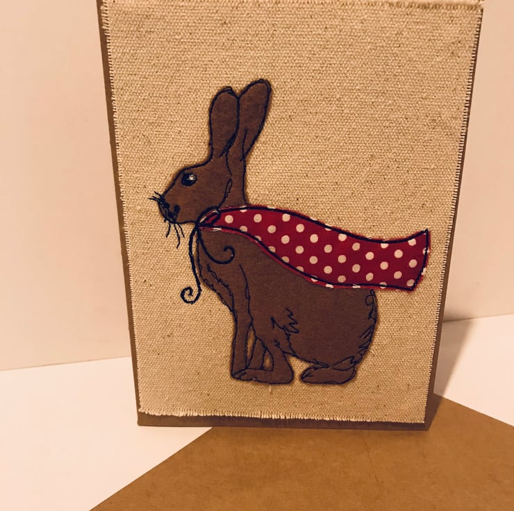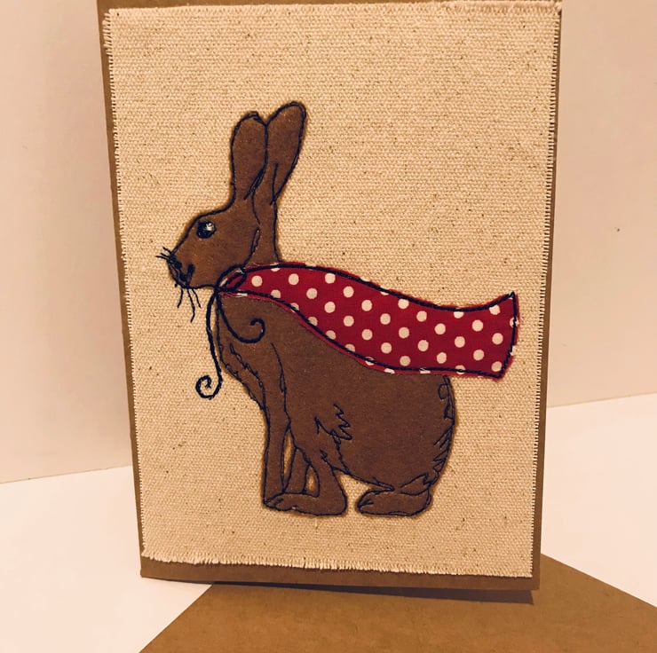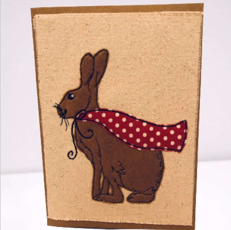 The March Hare card is embroidered applique on calico and mounted on brown card, blank inside for your own message