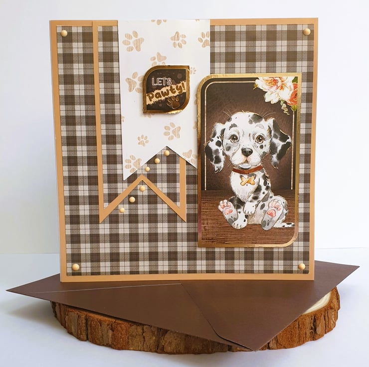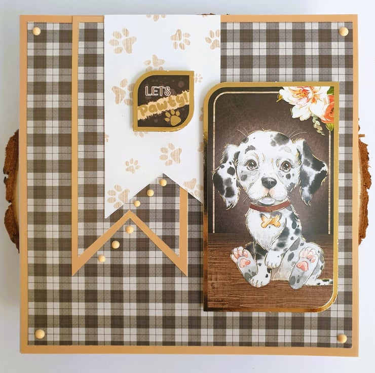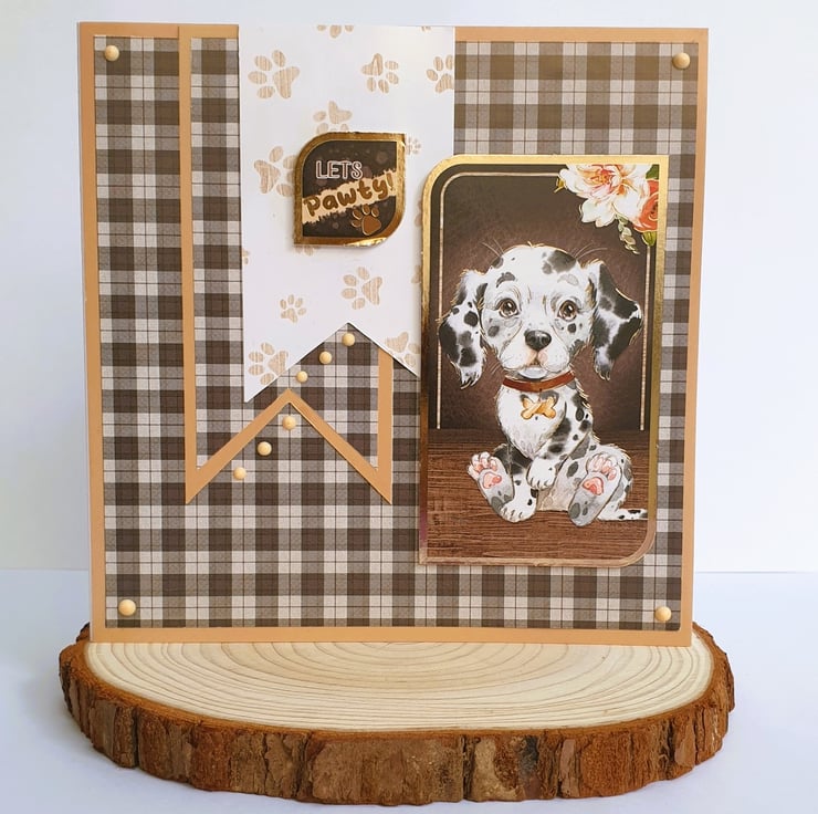 The Dalmatian puppy image topper and the "Let's Pawty" sentiment, are both mounted on foam pads to give dimension with the 3D effect.