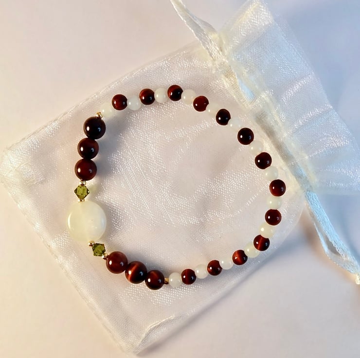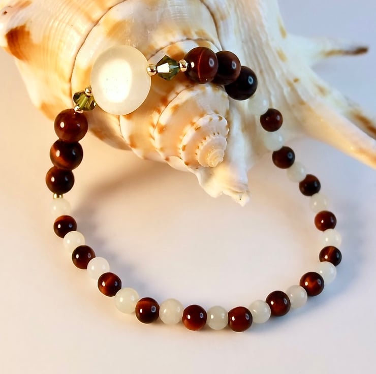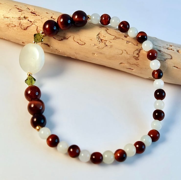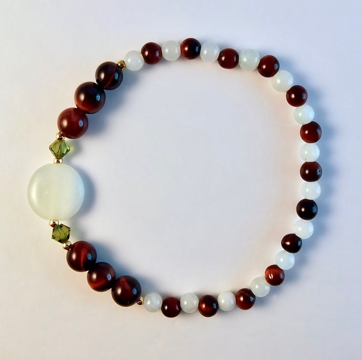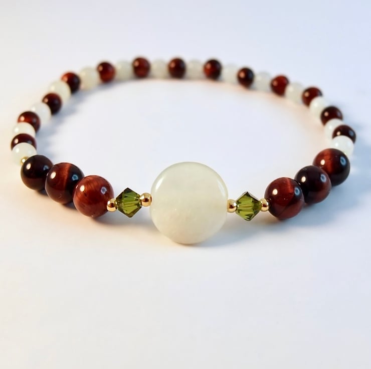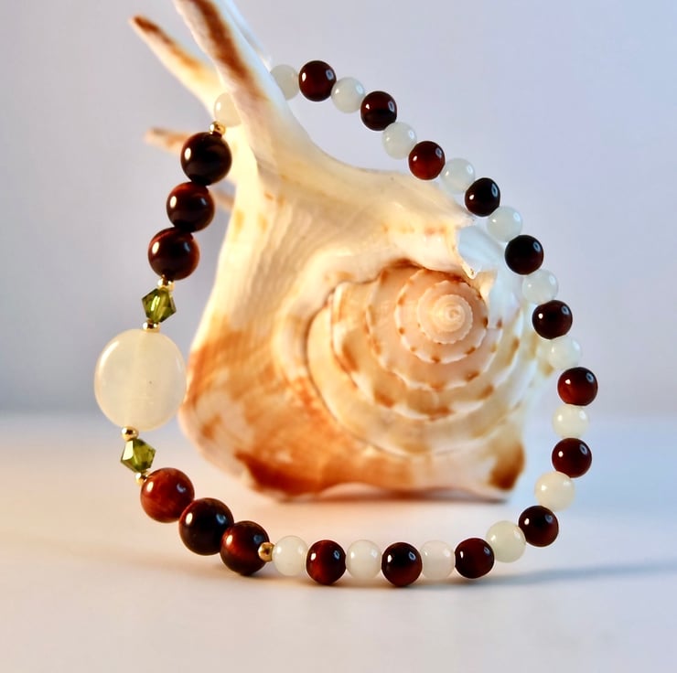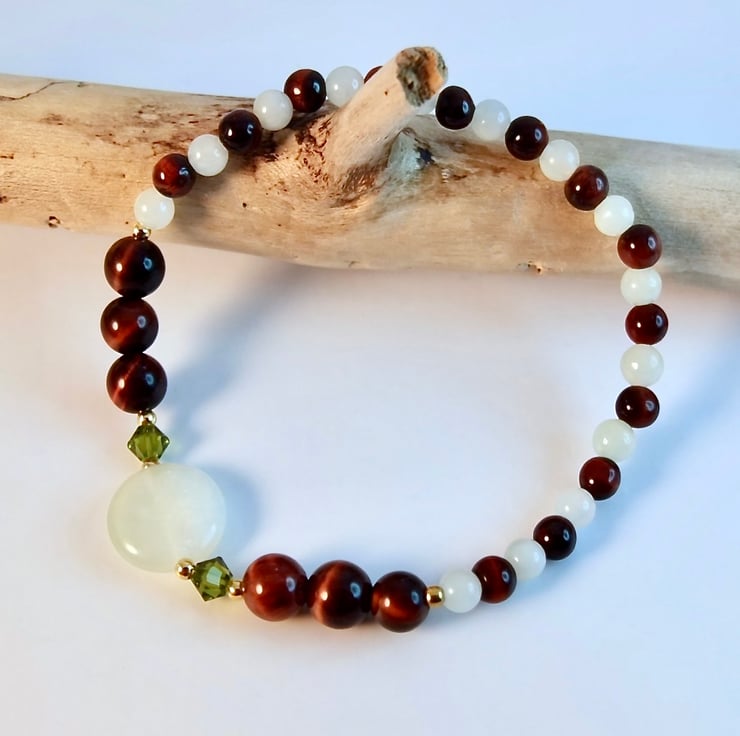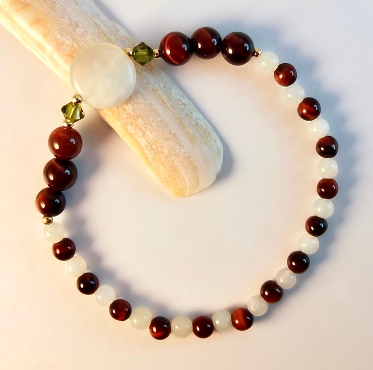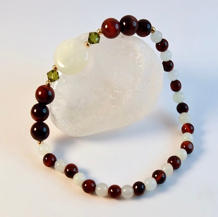 The circle is completed with 4mm red Tiger's Eye and New Jade rounds.