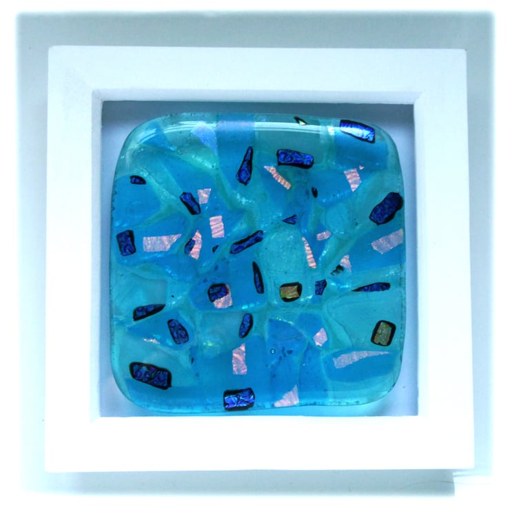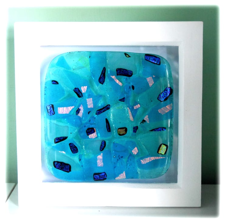 I have created a completely abstract picture using a base layer of clear glass which I then covered with a patchwork mix of different shades of turquoise fusing glass.