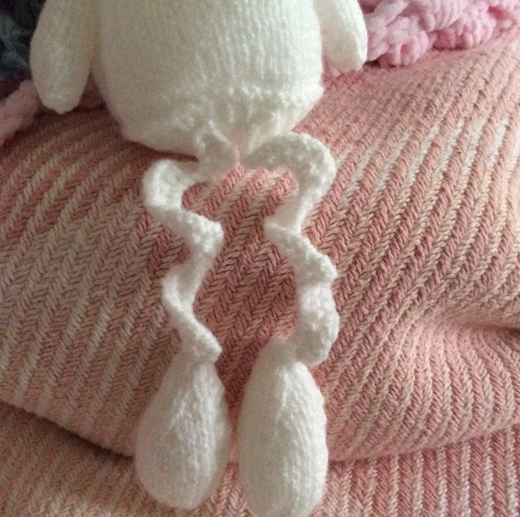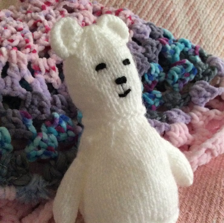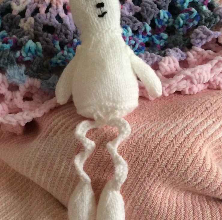Hand knitted in white acrylic yarn, lightly padded with polyester safety stuffing, and featuring twisted dangly wavy legs, he has cute little cub ears and a small tail