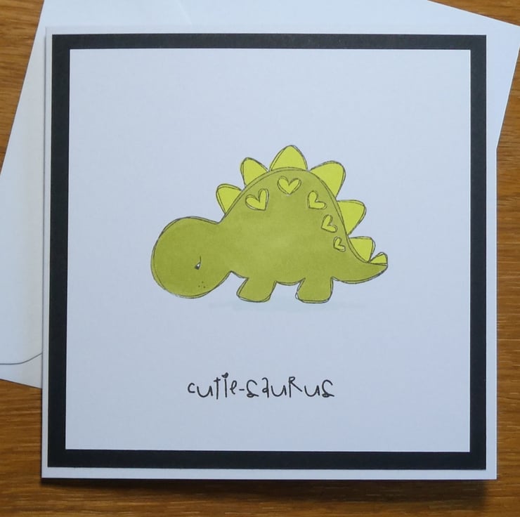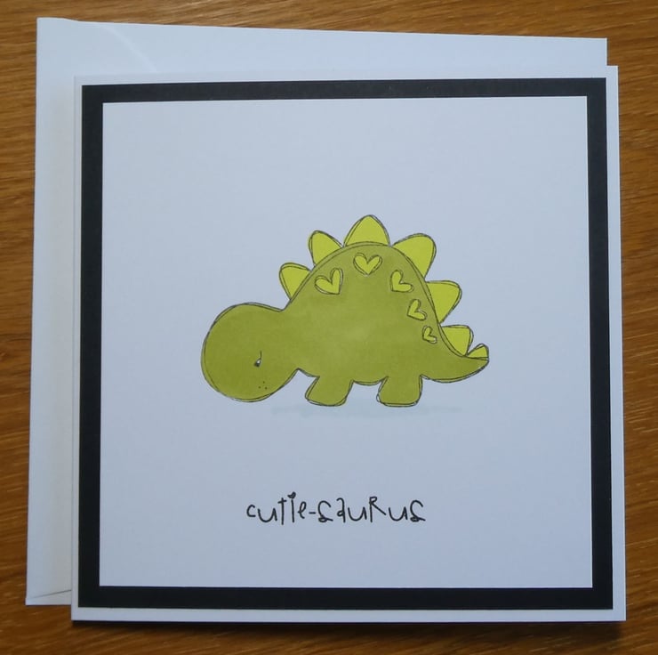 This little card has been hand stamped with an image of a cute dinosaur. It has been hand coloured in olive and lime green and finished with the message 'cutie-saurus'.