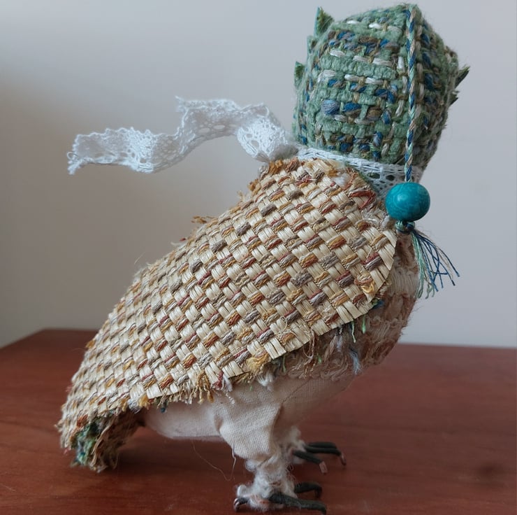 Quirky Hawk-like soft sculpture hand crafted from fabric remnants. Free standing. Approx 17cm height