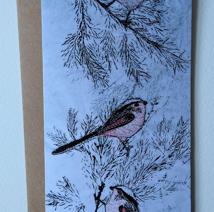 Did you know the Long Tailed Tit is actually a babbler not a tit? They're also one of the birds that raise their young communally. This card features a photograph taken from my original embroidered piece piece 'Better Together.'