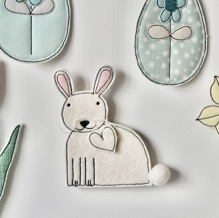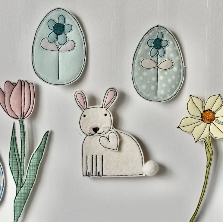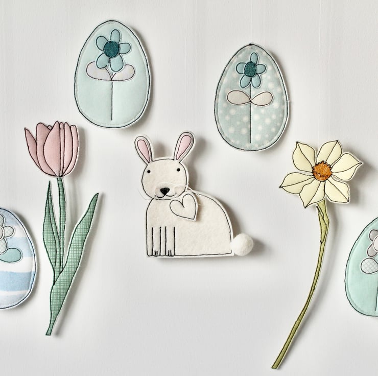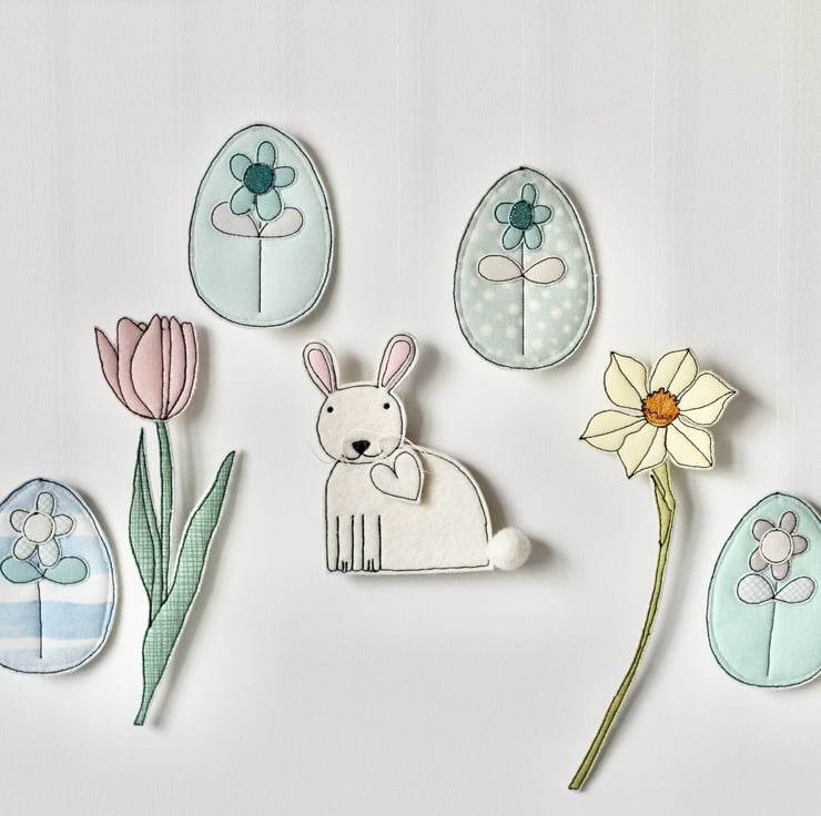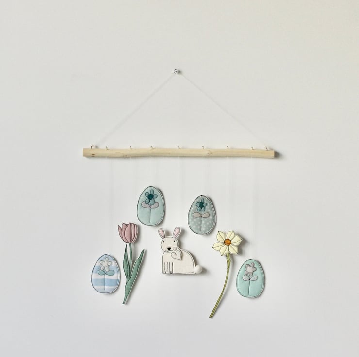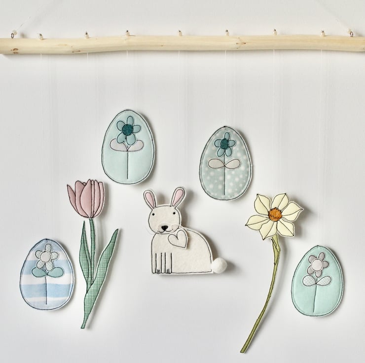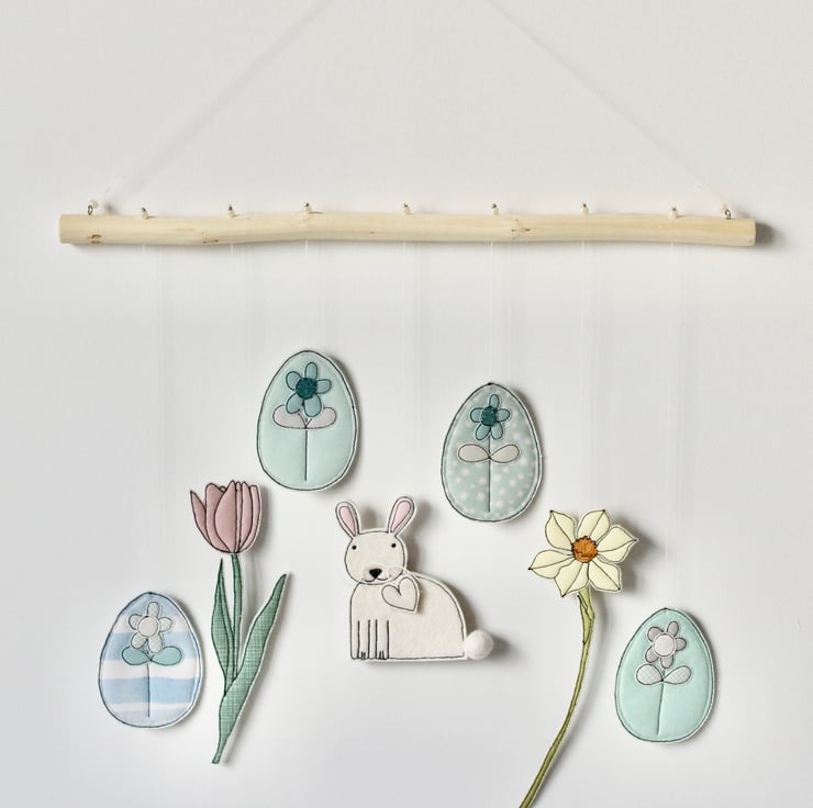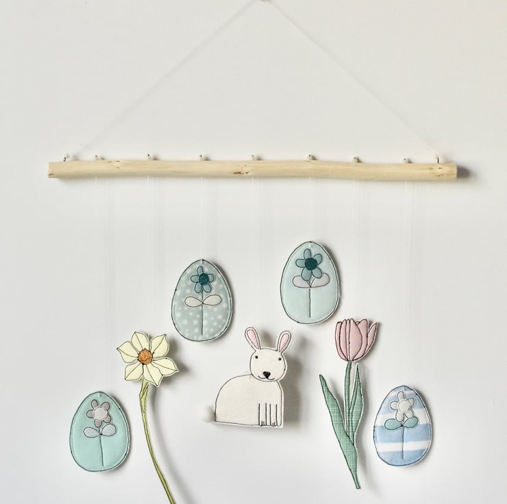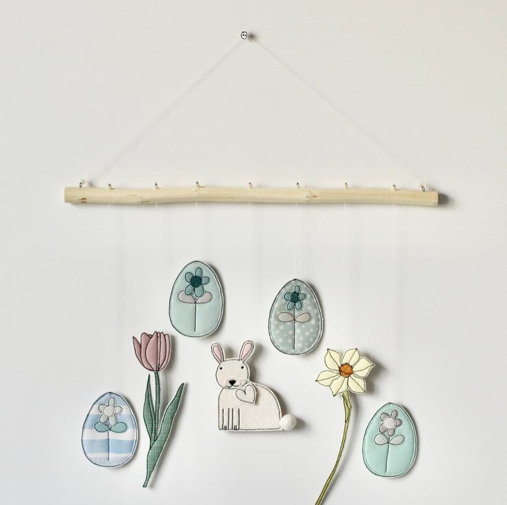 From a length of sanded drift wood are suspended seven handmade decorations; a tulip, a daffodil, a bunny and four eggs.