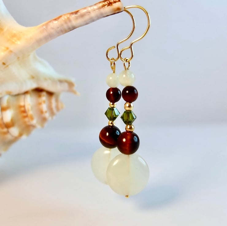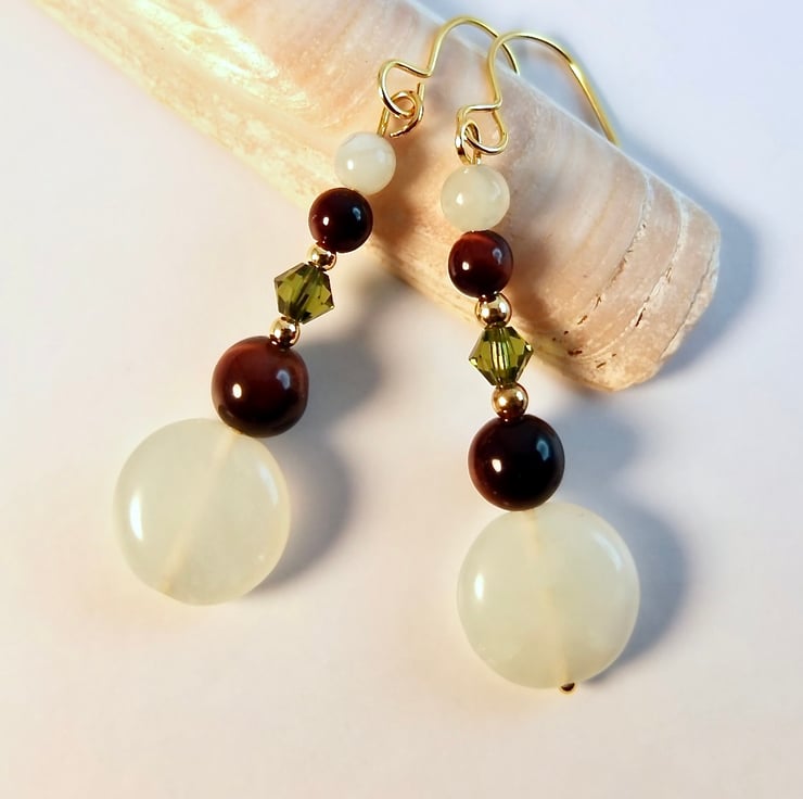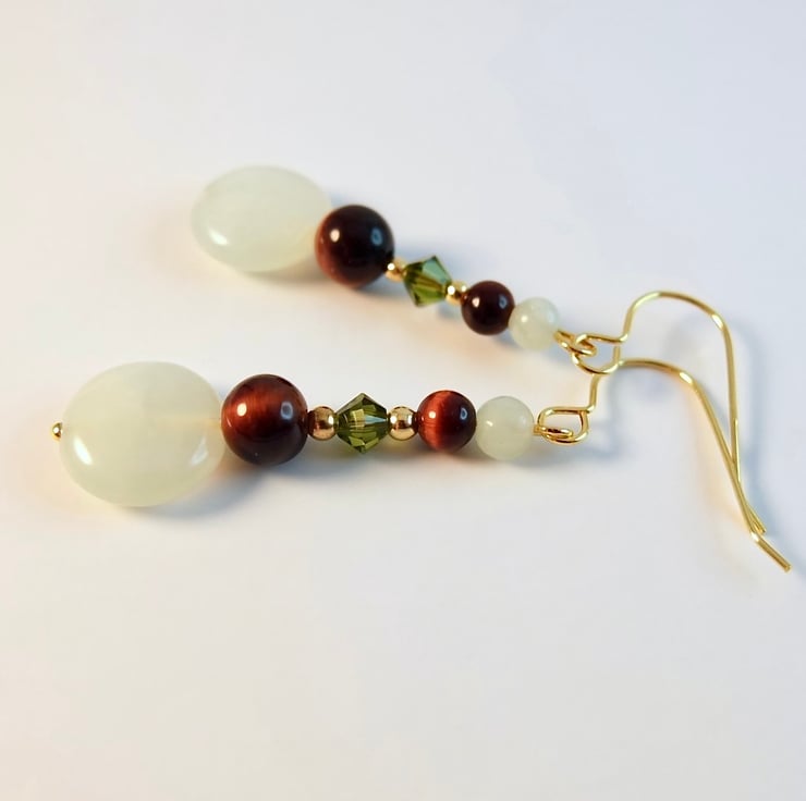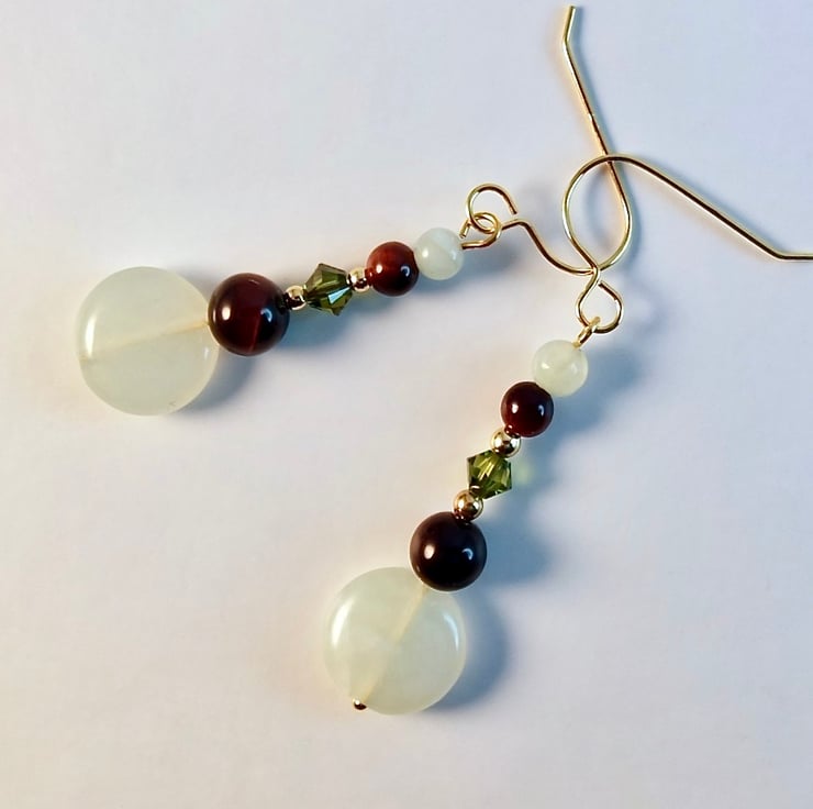 These drop earrings feature a 12mm New Jade coin topped with a 6mm red Tiger's Eye, 4mm 'olivine' Swarovski bicone, 4mm red Tiger's Eye and 4mm New Jade bead.