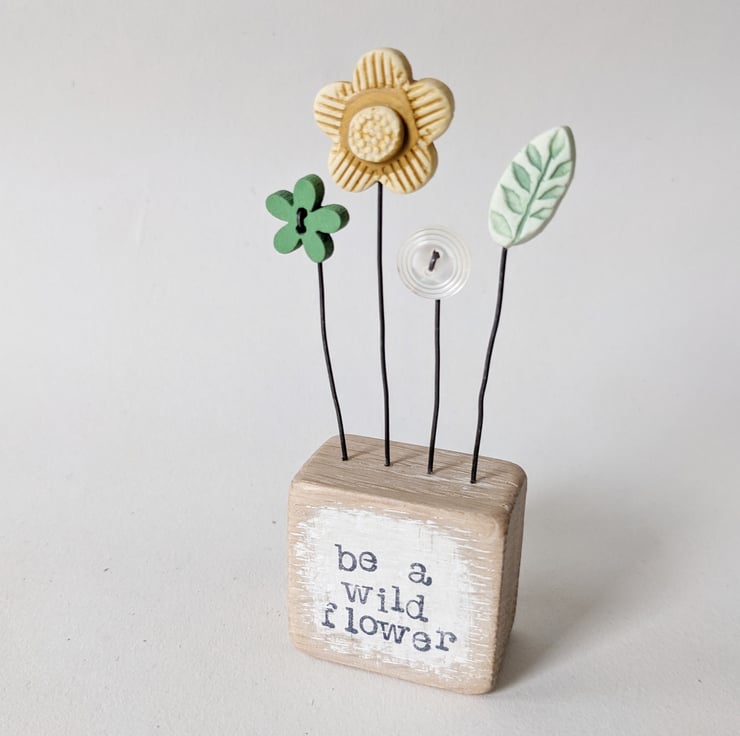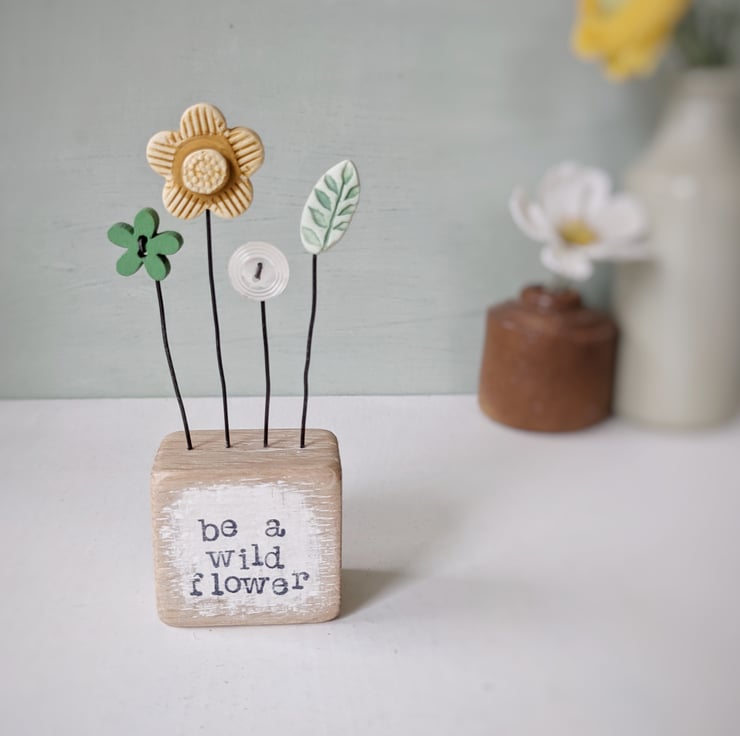 A pretty clay flower and leaf stand on wire stalks in a painted wooden block.