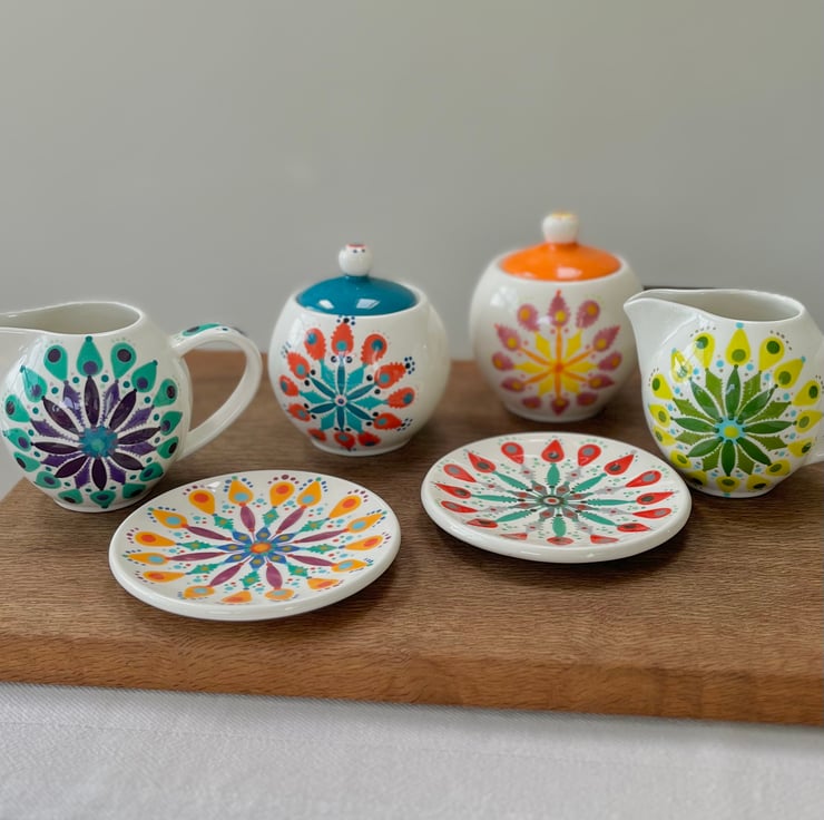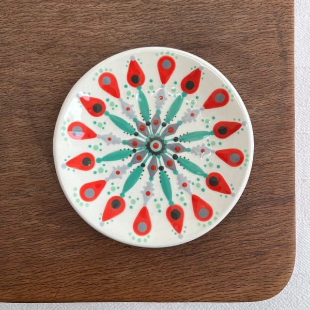 Each plate has been hand painted using bright complimentary coloured underglazes. The design centres around a dot and fans out with a series of geometrical shapes to create a beautiful mandala style pattern.