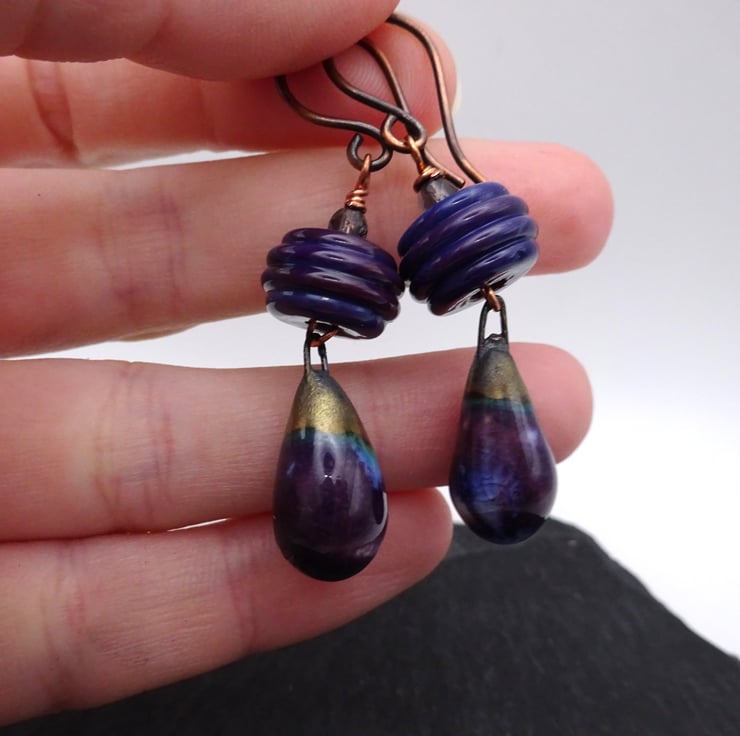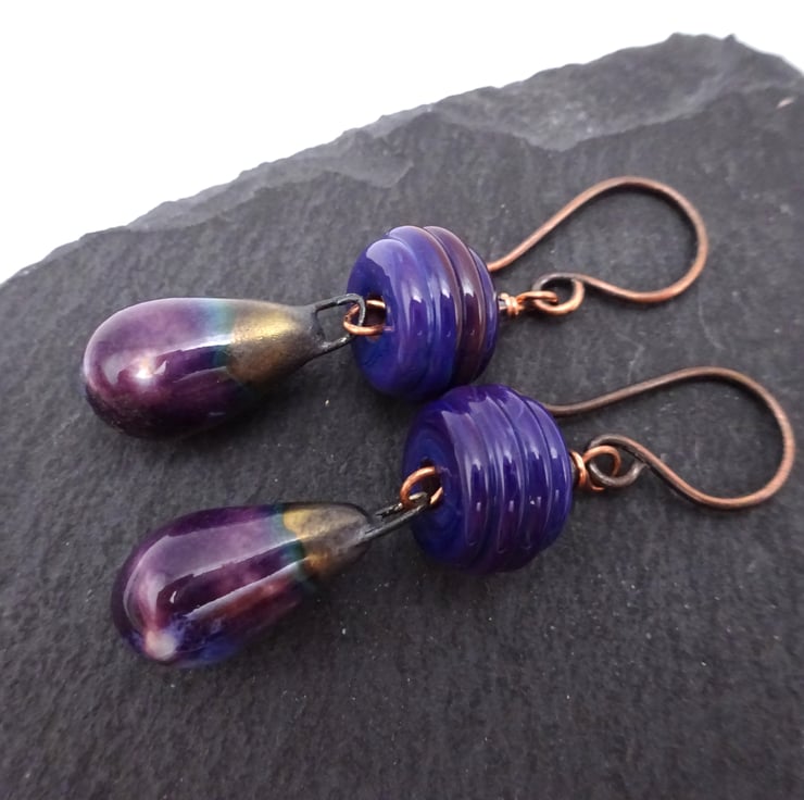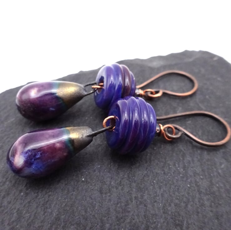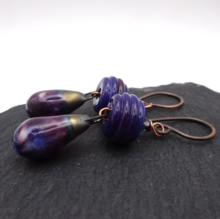 A pair of earrings made with handmade copper ear wires, handmade lampwork glass beads and handmade ceramic drops with a purple glaze.