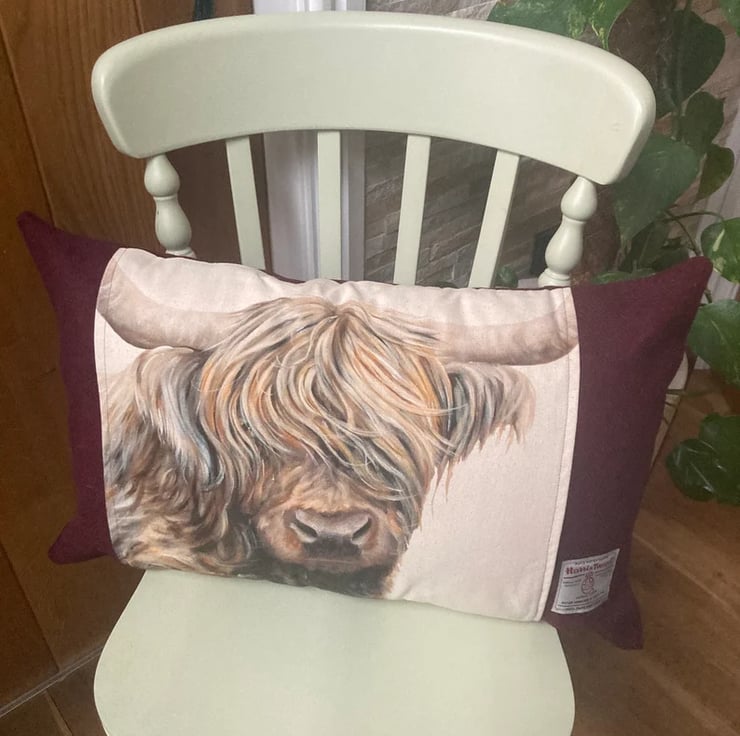 size 60 cm x 40 cm using Harris Tweed plain Plum Fabric, with highland cow on the front.