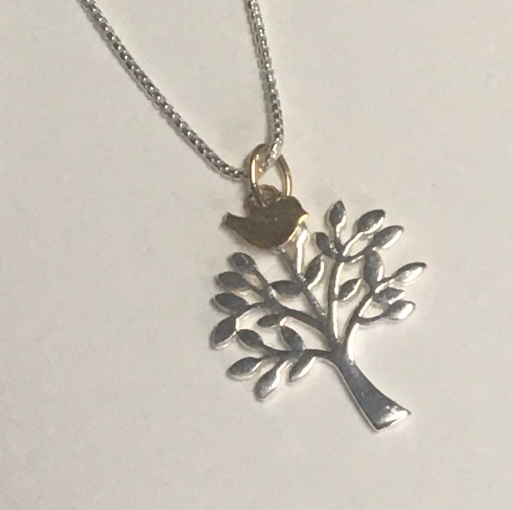 Beautiful and simple tree of life openwork pendant in sterling silver, with a tiny silver bird hanging at the top.