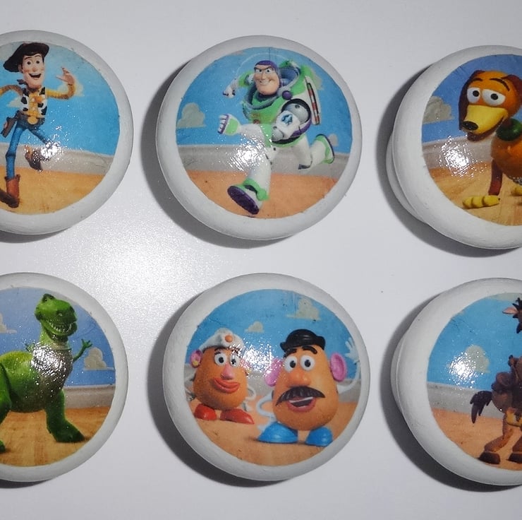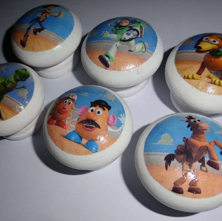 I source designs, print and cut them out by hand then glue the designs to the knobs