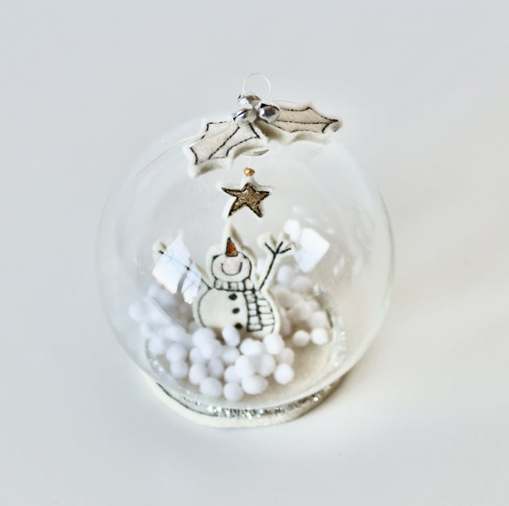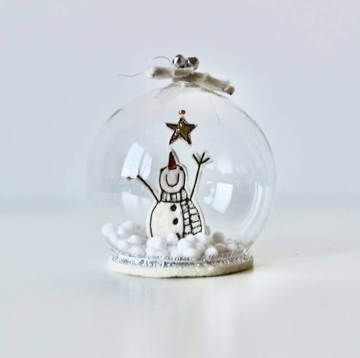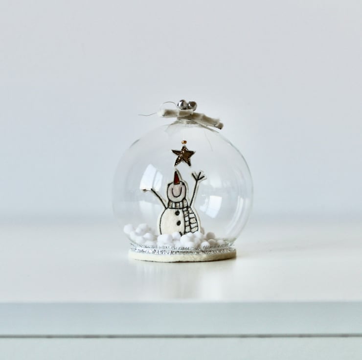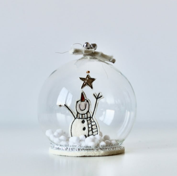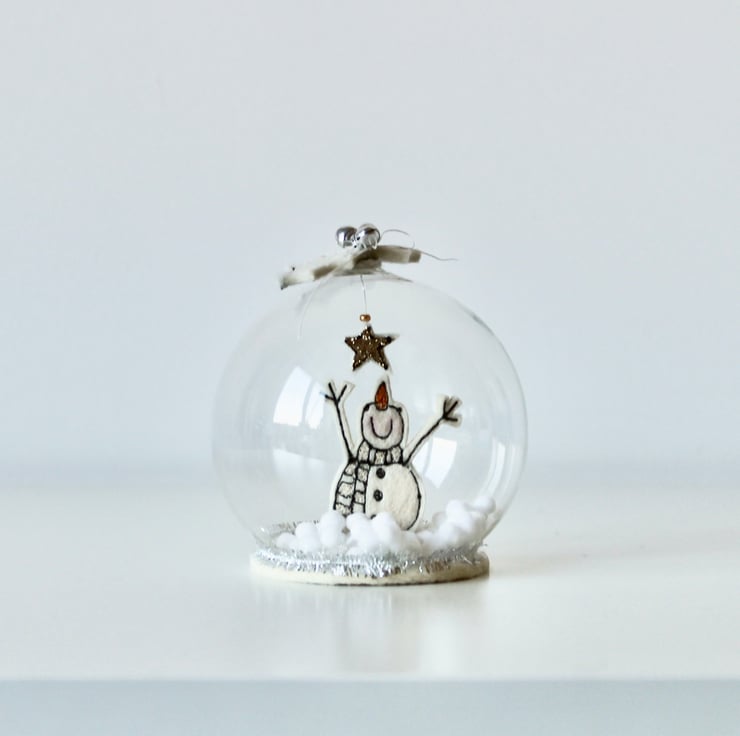Mr Snowman glass dome is created using free hand machine embroidery, 100% wool felt, glitter cloth, metal bells and a glass bead; each part of the design is cut out by hand using very sharp scissors!