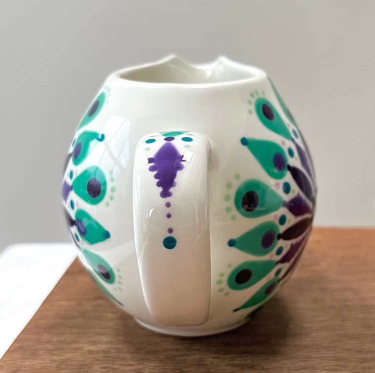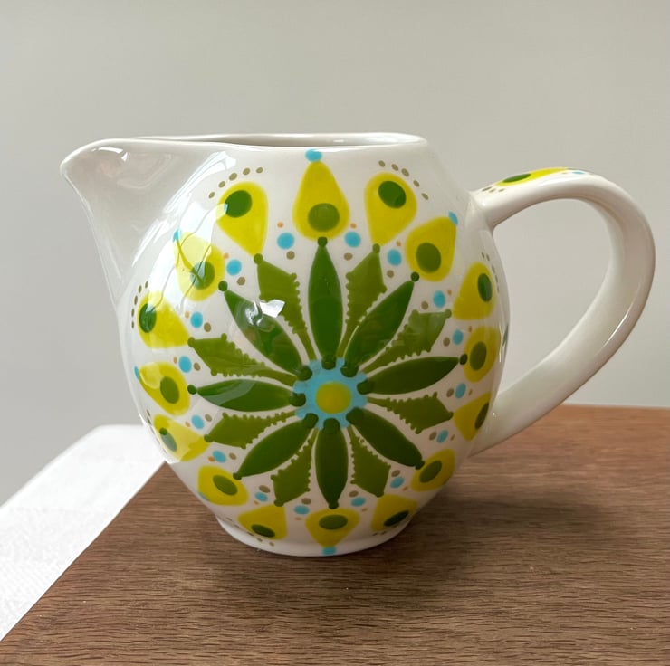 Each jug has been hand painted using bright complimentary coloured underglazes. There are two large mandala designs, one on each side of the jug. The design centres around a dot and fans out with a series of geometrical shapes to create a beautiful mandala style pattern. A small design has also been added to the top of the handle, so the just looks fabulous from all angles!