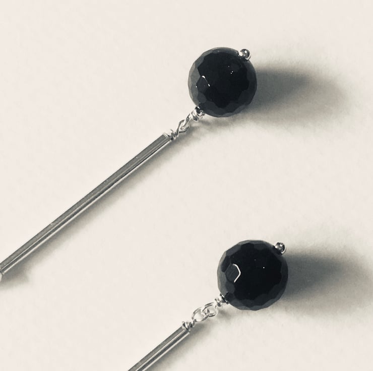 They feature faceted real black agate beads which hang from beneath a fine threaded sterling silver tube.
