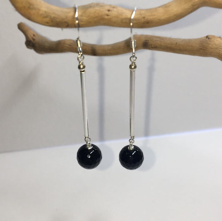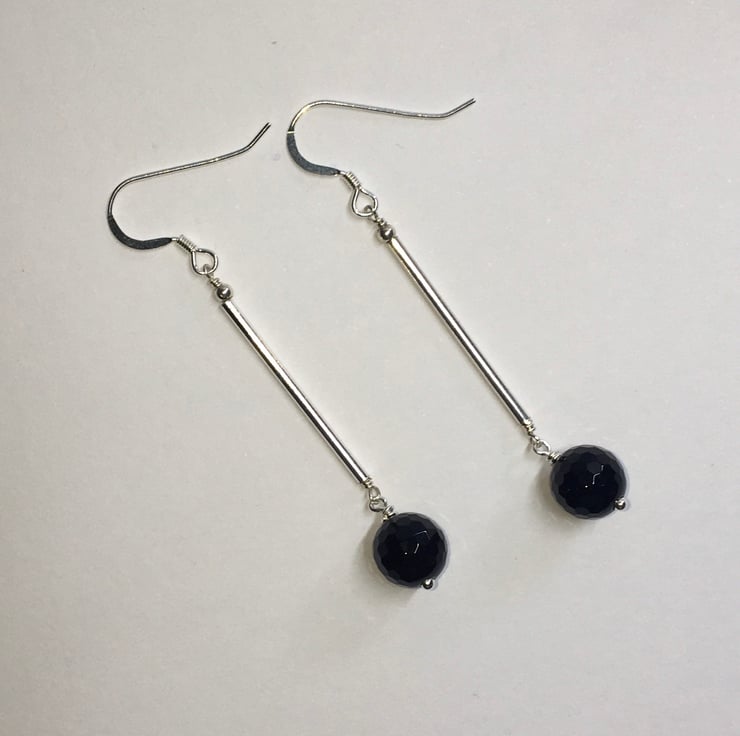 They feature faceted real black agate beads which hang from beneath a fine threaded sterling silver tube.