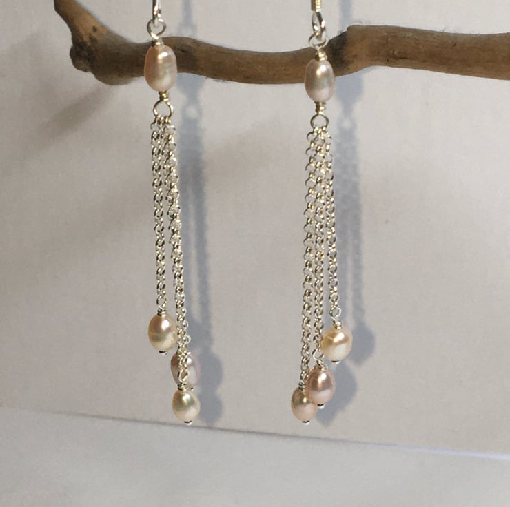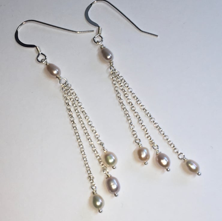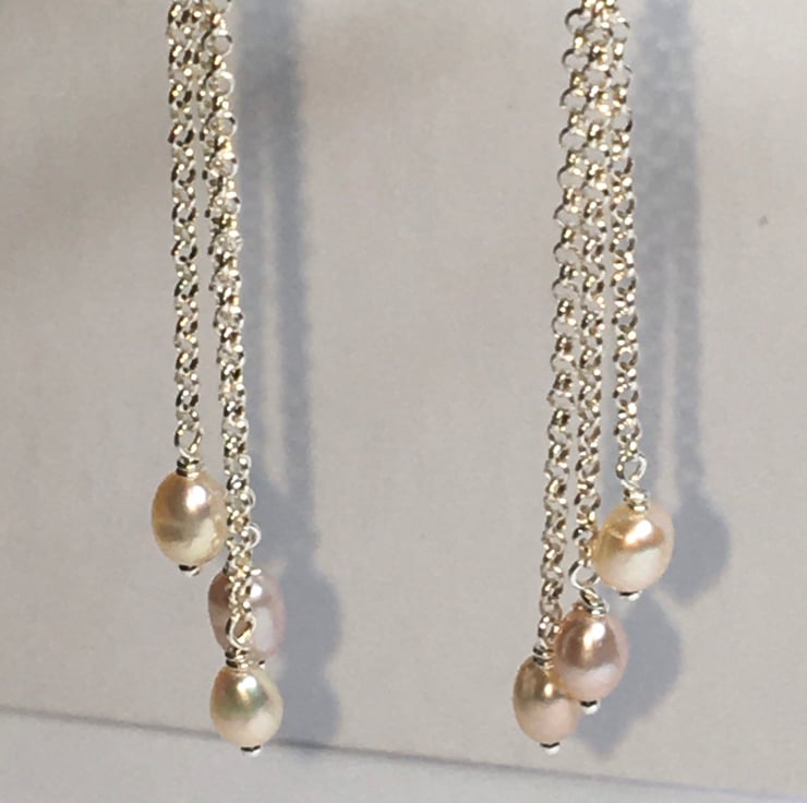 Each earring consists of very pretty natural 4mm rice pearls which I have wire wrapped to three strands of sterling silver chain. These have then been wrapped to a single pearl.