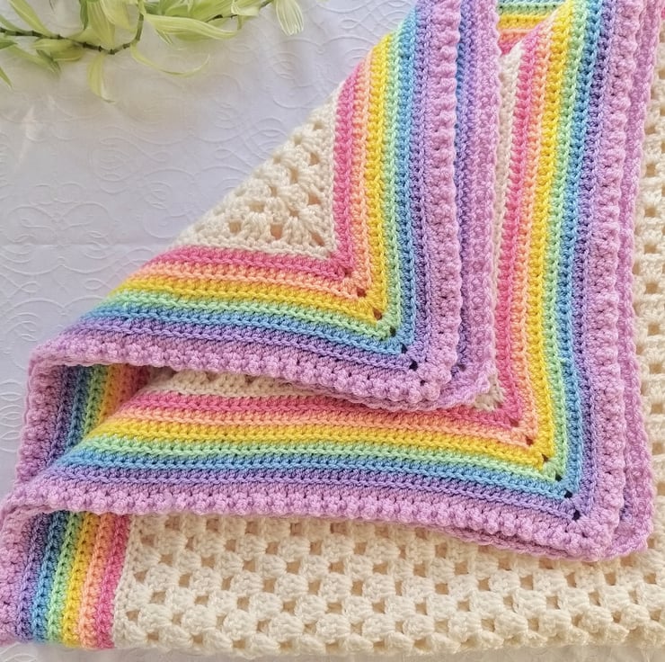 This granny square blanket is made from soft acrylic yarn in soft cream colour with a pastel rainbow border.