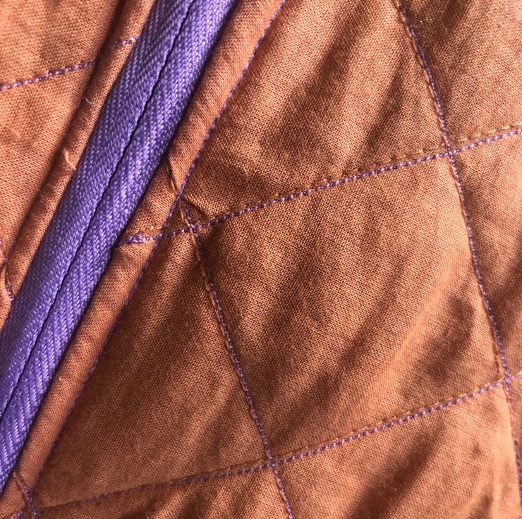 For this piece i decided to repurpose a jacket and re-use the fabric. The burn faded orange cotton fabric was already quilted but for more originality, i sow over the existent stitch in a lilac thread to compliment the colour of the zip, also lilac.I used a black zip on the back panel.