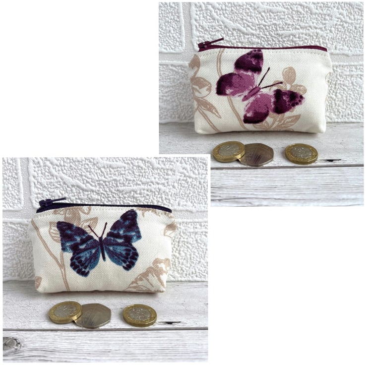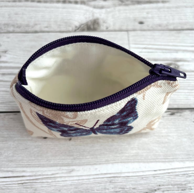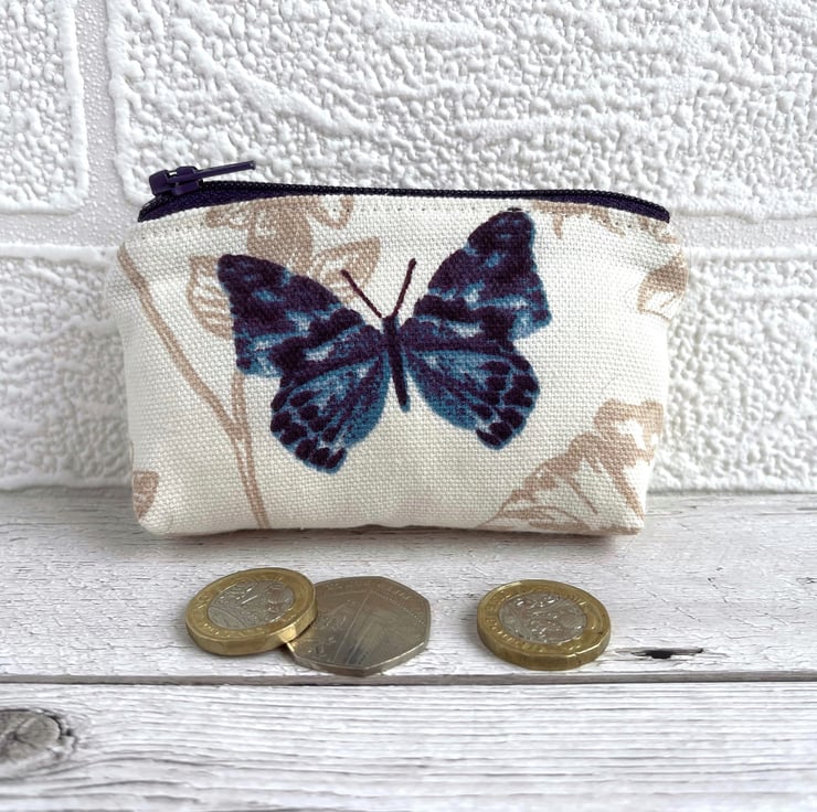 Small purse with purple and blue butterfly. This delightful little purse is made from pretty print fabric with a pattern featuring a butterfly in lovely shades of indigo purple and blue. The butterfly is set against a backdrop of subtle and delicate beige flowers and foliage, on a cream background. The coin purse fastens with a matching indigo purple zip and has a cream lining. The base of the purse is boxed to give extra space inside.