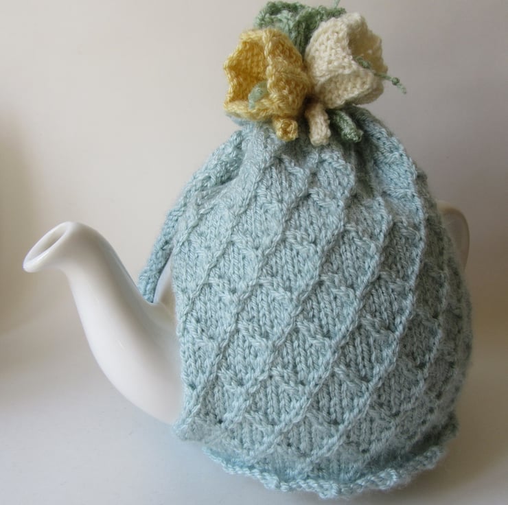 A beautifully knitted duck egg blue tea pot cosie with three knitted crocus flowers. The body of the cosie is knitted in a beautiful duck egg blue coloured yarn, using my statement trellis stitch. Nestled on the top are three knitted crocus flowers in primrose yellow, cream and pastel green. The cosie is tied together using a handmade cord in a matching duck egg blue coloured yarn. The cosie will fit snuggly but with enough ease for a swift removal when a top up is required. The tea pot handle peeps through the side opening so it dosnt get too hot to handle. The tea cosie will fit a standard 4 - 6 cup tea pot.