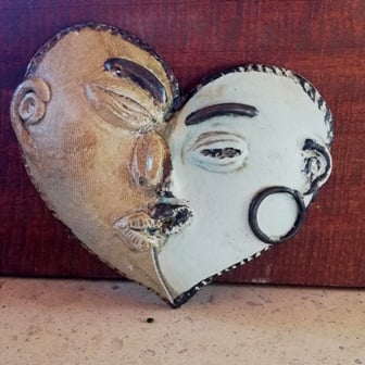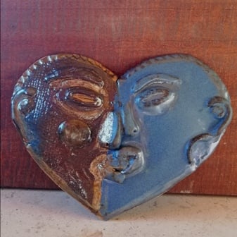 Handbuilt stoneware 2 face halves, kissing, serene and loving.