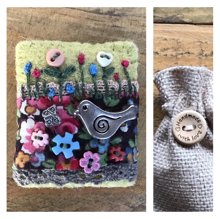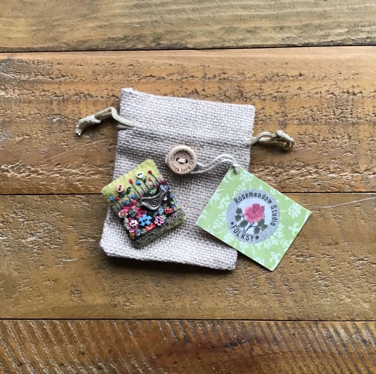 Hand sewn/embroidered. Measures 3x3.5cm. Please view shop and click/scroll down “about” for details.