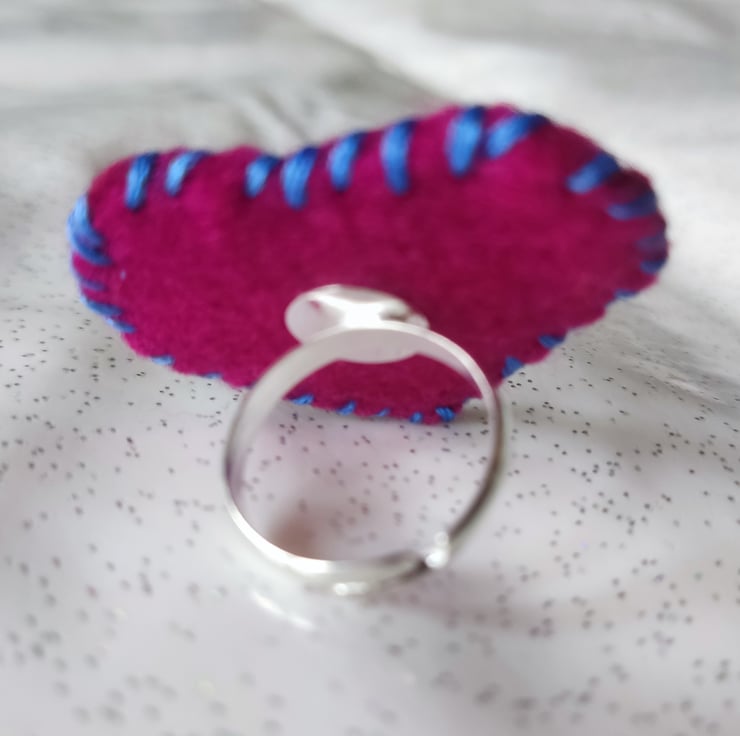 Handmade dark pink heart ring made with felt and hand stitched with a contrasting blue embroidery thread and attached to a silver coloured adjustable ring base.