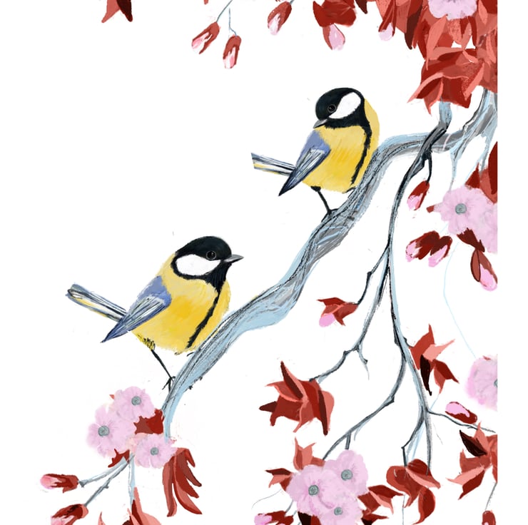 This is a favourite art print with many customers and was influenced by the great tits nesting next to my blossom tree