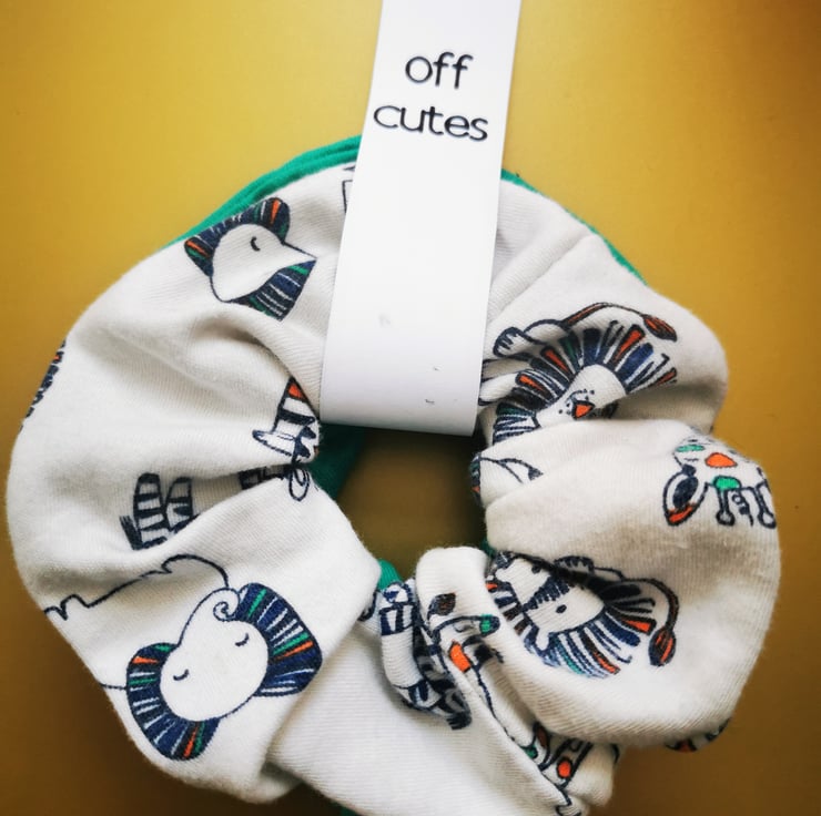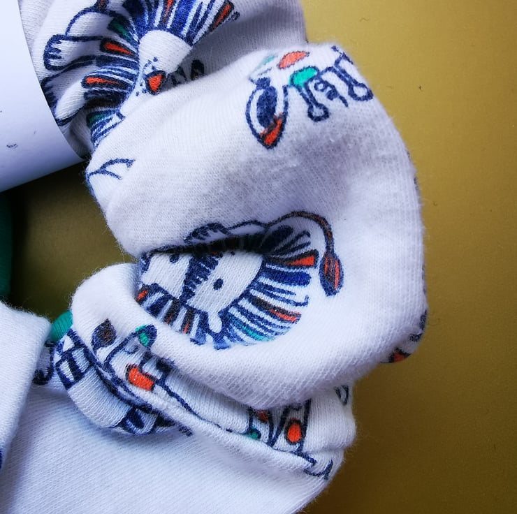 One from a babygro which was covered in colourful animals and a complimentary bright green. Both super soft.