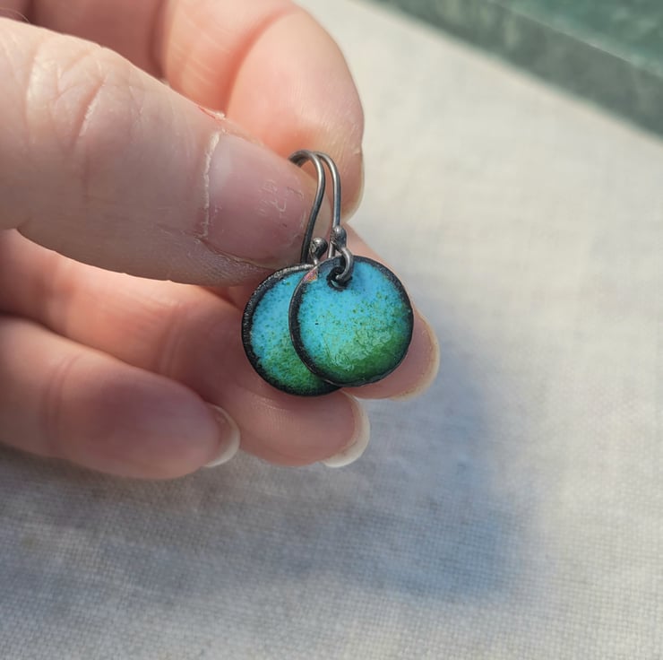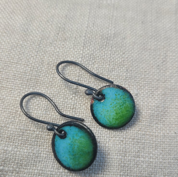 Small copper disc earrings with blue and lime green enamel.