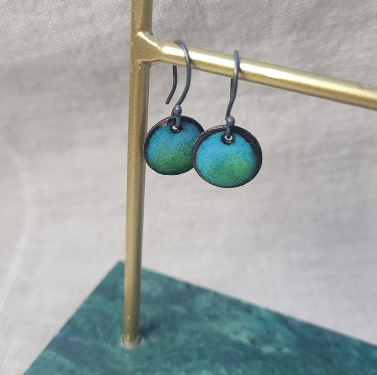 These circle enamel earrings are slight seconds as the enamel as burnt out slightly on one end of one of the earrings, leaving more of the black copper border.