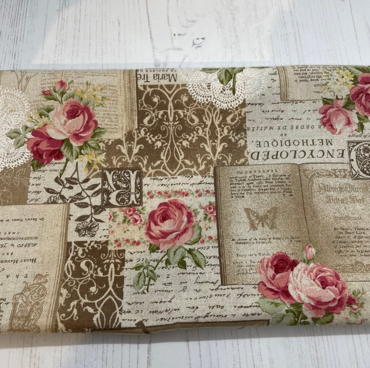 Lovely printed length of linen fabric. Roses , butterflies, books