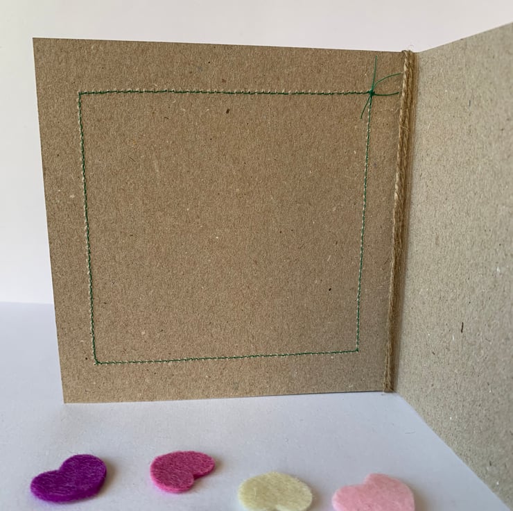 The hessian is machine stitched, using a contrasting thread, onto a plain brown recycled card. This stitching is visible on the inside of the card.