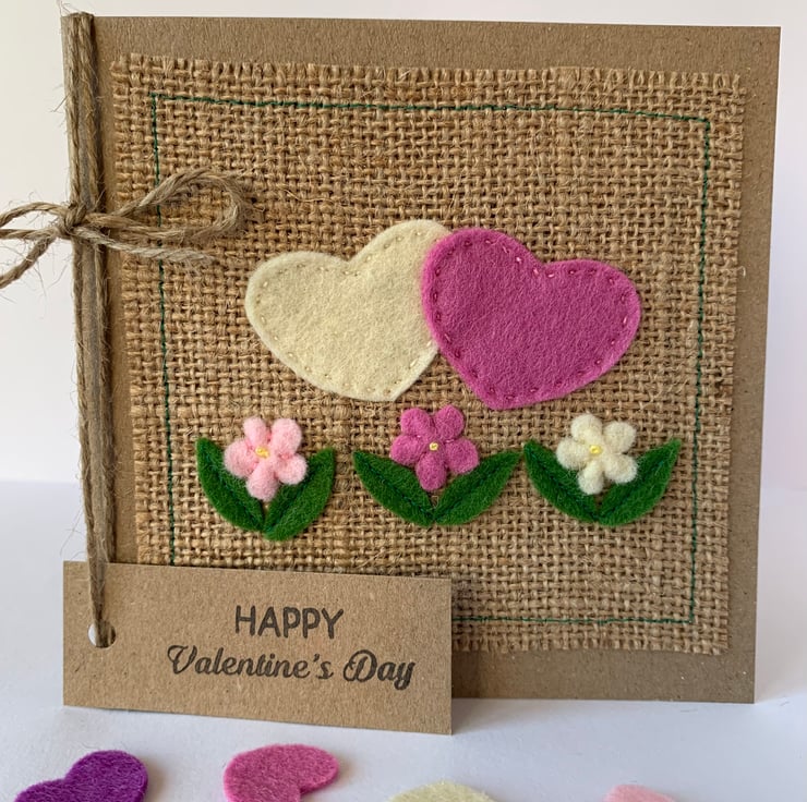 A unique card to send on Valentines Day. This handmade Valentine card is decorated with two hearts in rose pink and cream and flowers in cream and pink. The decoration is hand cut from 100% wool felt. It is then sewn by hand and machine onto a hessian background.