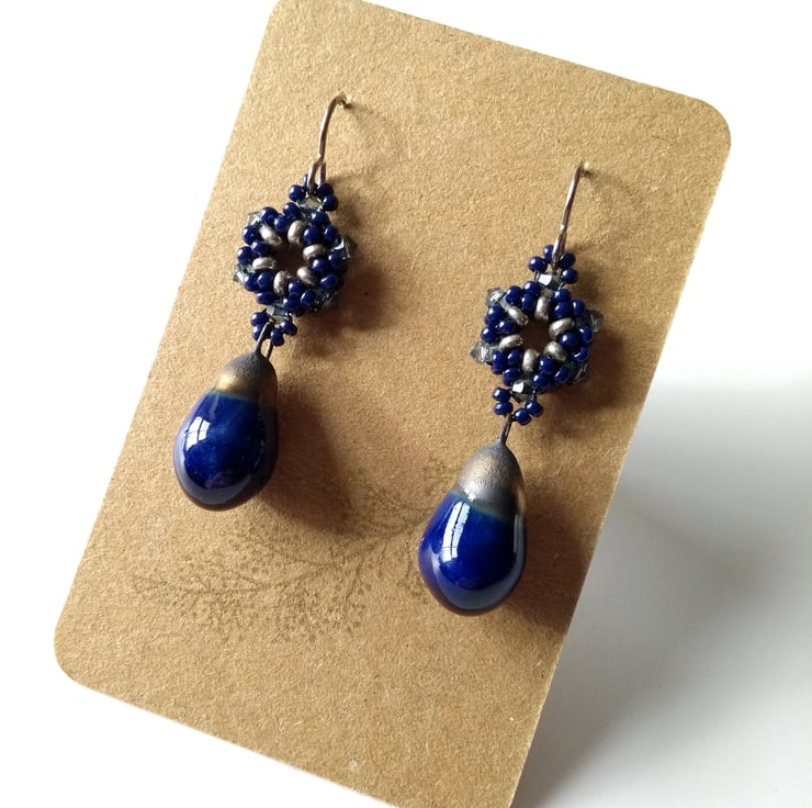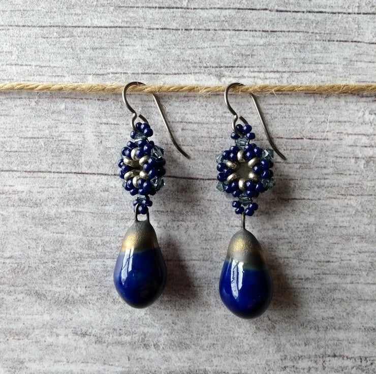 This pair features ceramic drops in Mirror Blue, a glossy navy glaze, together with a hexagonal beaded component in antique silver and navy, along with a border of sparkly 3mm crystals in pale Montana blue by Preciosa. This pair has been strung on hypo-allergenic titanium earwires in antique silver.