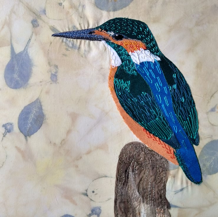 That flash of colour is unmistakeable and nothing brightens my day more than a Kingfisher sighting! This card is a photograph of my Kingfisher hand and free motion embroidered portrait.