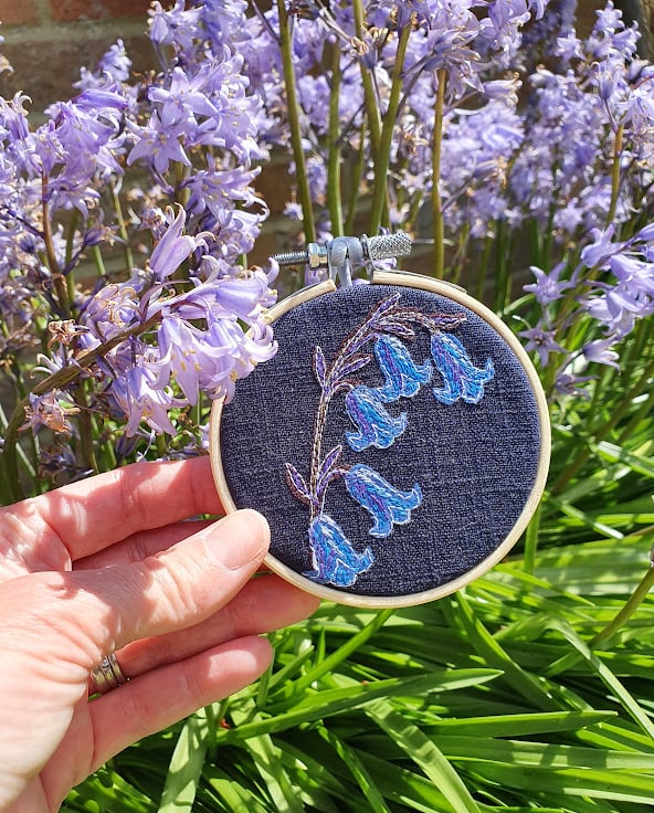 Handmade hanging decoration, Bluebell mini hoop, applique & embroidery, flowers
