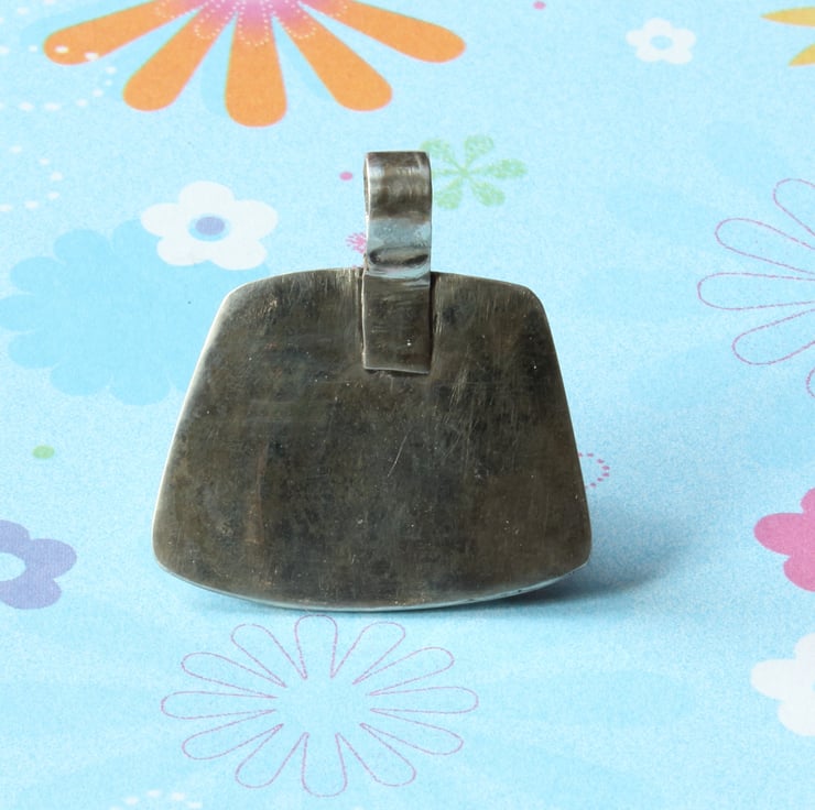 It measures 3.5cm across and 3.5cm from the top of the hook to the bottom of the pendant. I will send it on a string cord, but as you can see the hoop is of a good size to add a chain of your own.