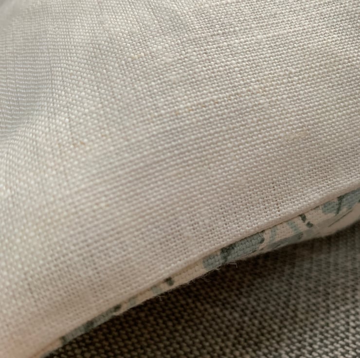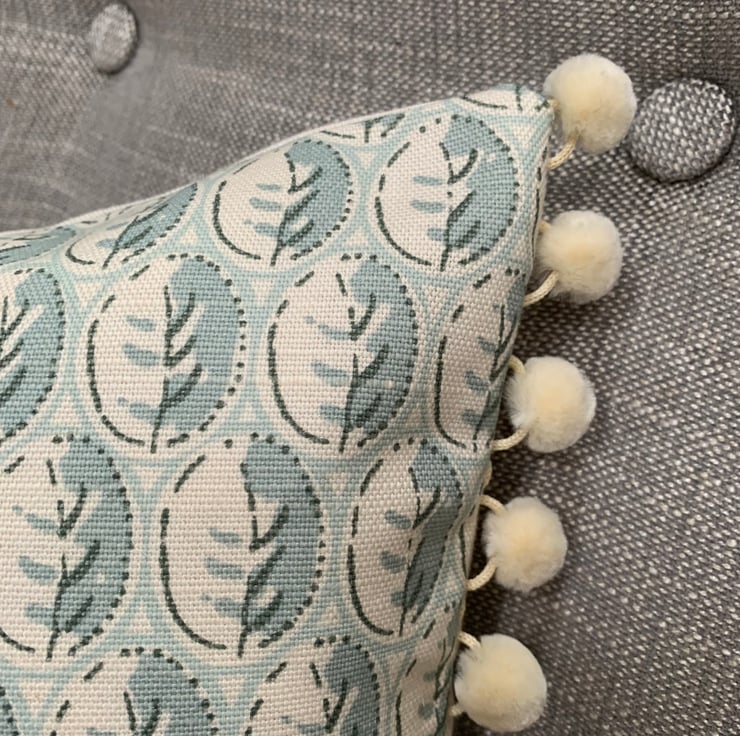 Pretty cushion cover for a 12x18” filler (30x45xm) in Vanessa Arbuthnott Little Leaf linen union. It is backed with plain cream linen and trimmed on the ends with velvety cream pompoms.