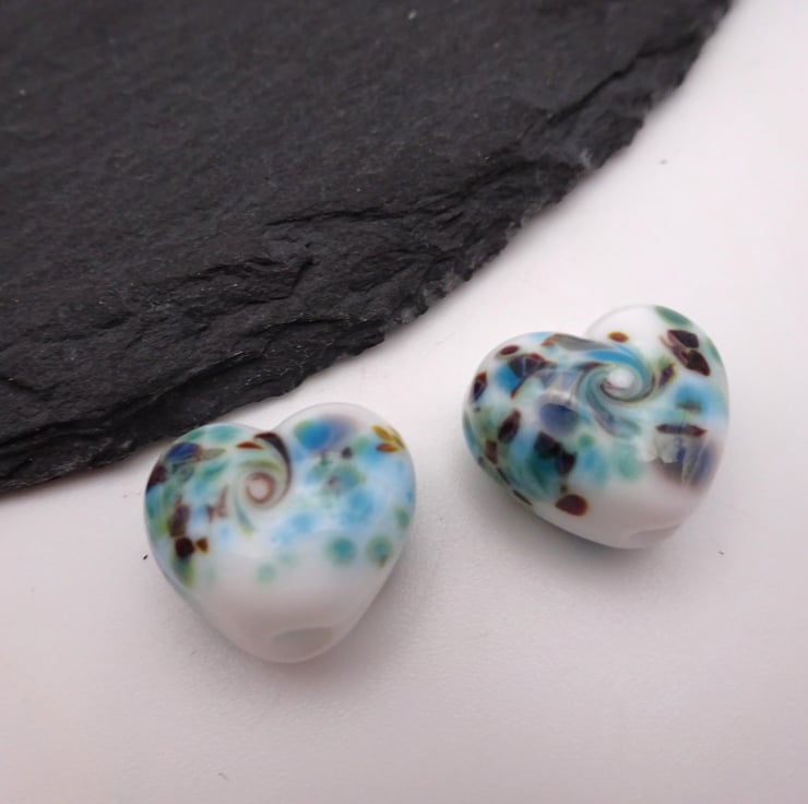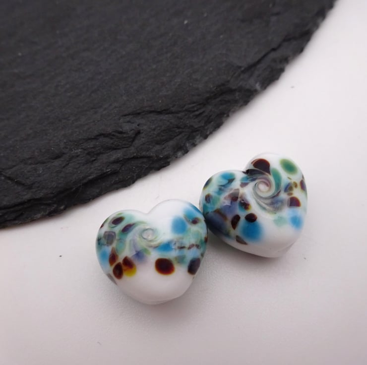 A pair of handmade lampwork glass beads made with white glass and rolled in blue/ brown frit, they shaped into hearts using a brass press.