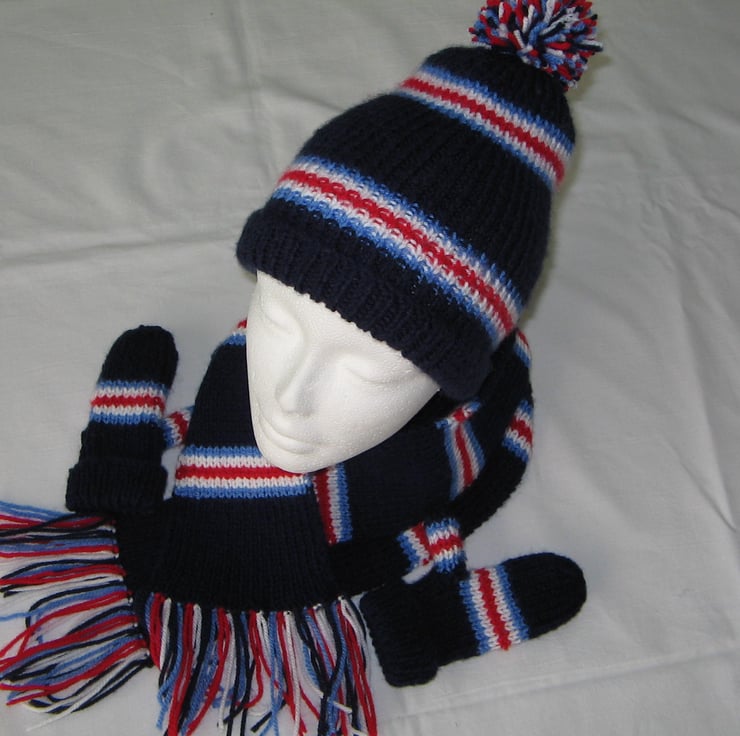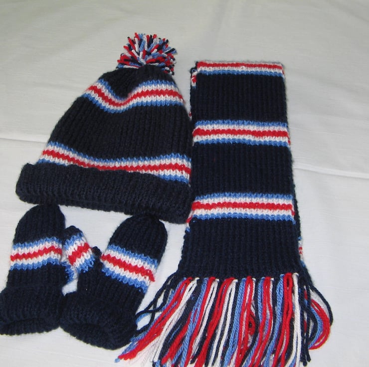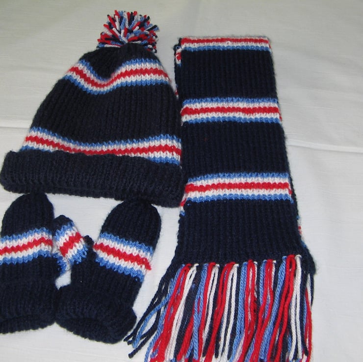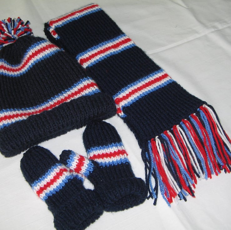 Matching hat scarf and gloves always look nice and in these patriotic colours of red white and blue what could be better