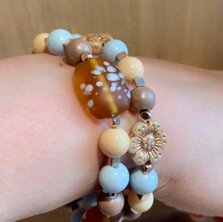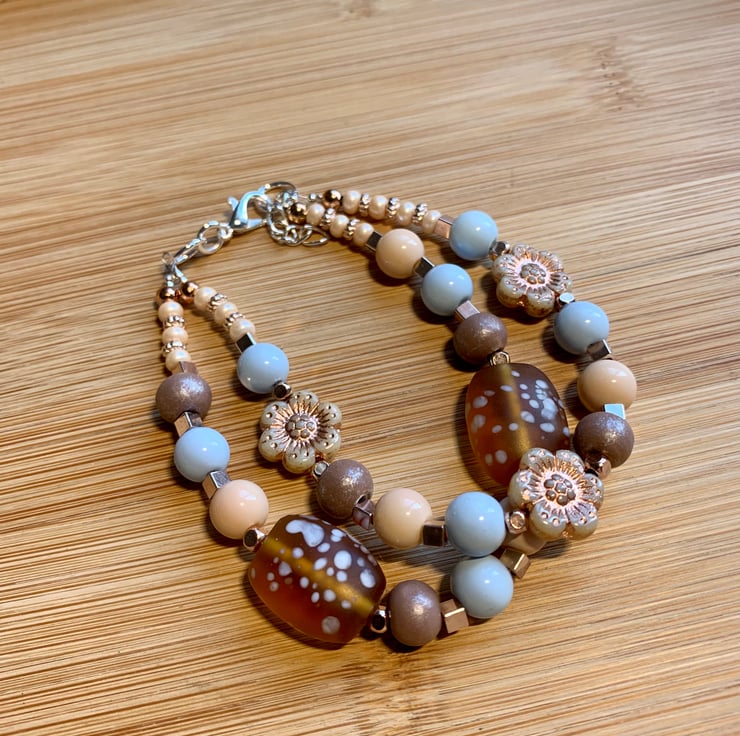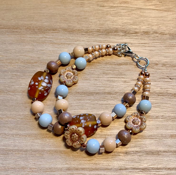 This eye catching pretty bracelet is made with beautiful quality glass beads in powder blue and nude, hand blown pale amber speckled feature beads, Czech glass cream and rose gold painted flower beads, wooden shimmer mocha beads, gold tone cube spacer beads which give a thoroughly modern edge, rose gold spacers and cream glass seed beads.