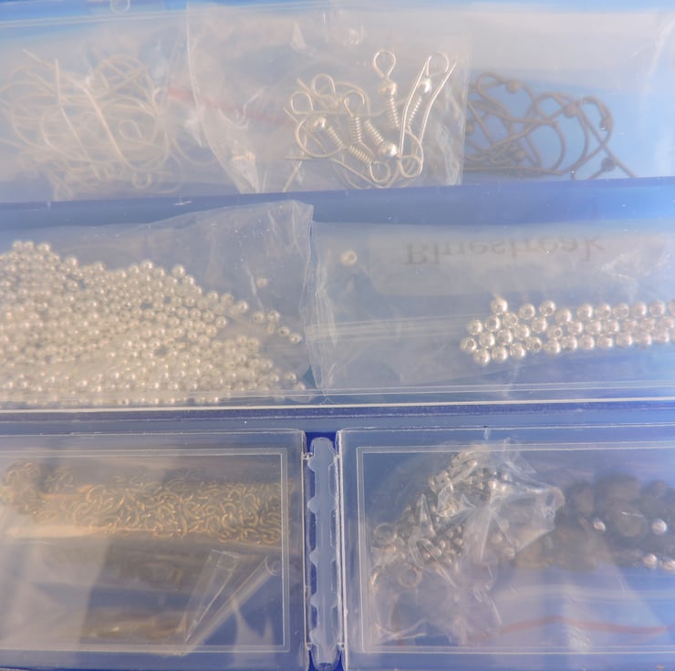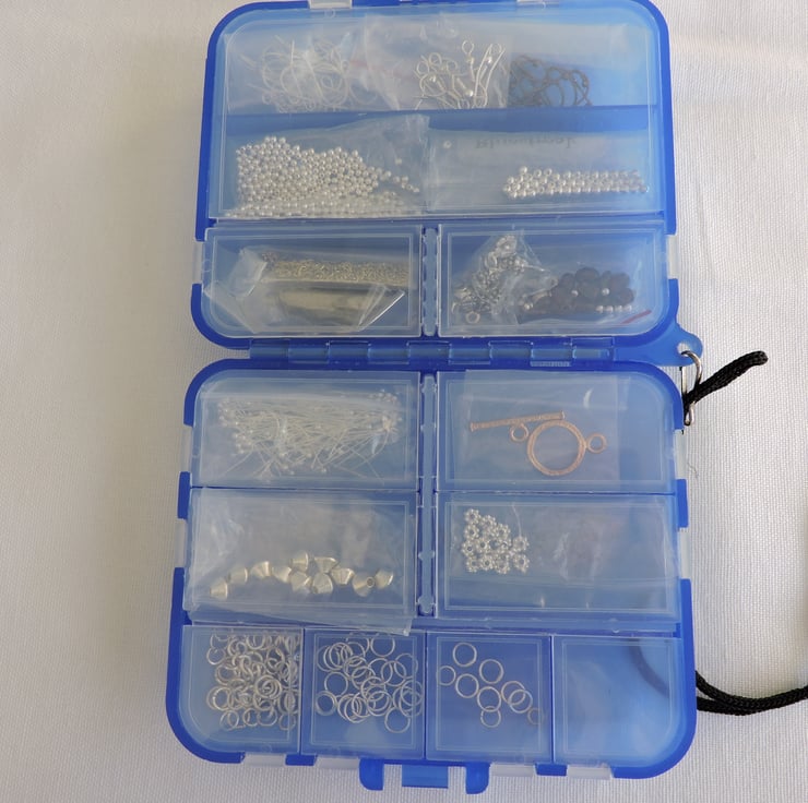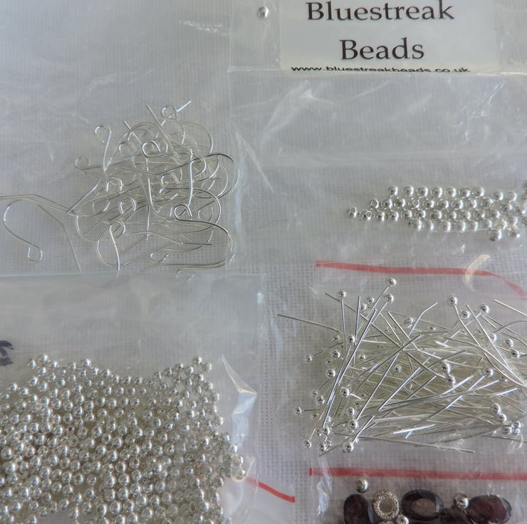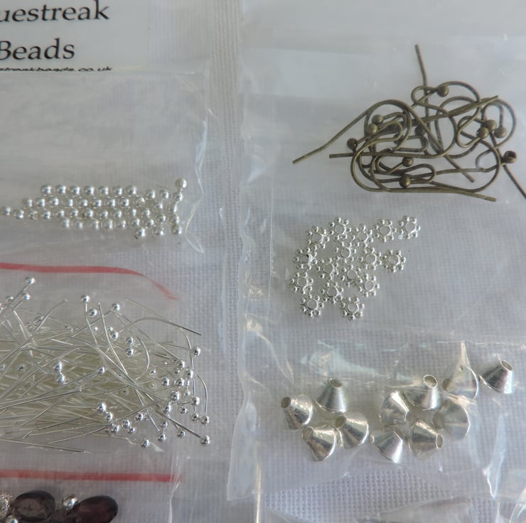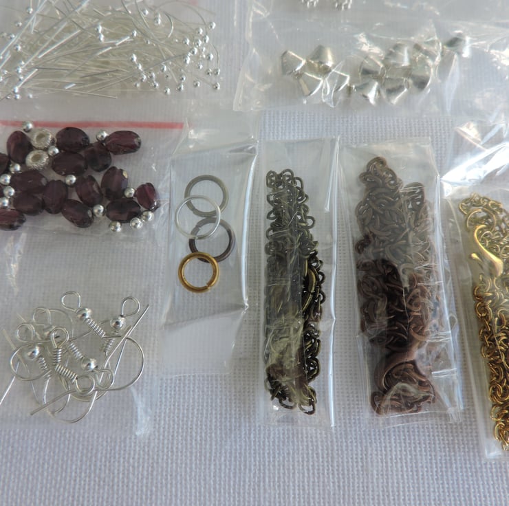 An assorted lot of jewellery findings. ear wires, spacers, headpins, eye pins, a gold plated toggle clasp, chains and beads. Some sterling silver, mostly silver plated. The little beads are garnets. Box included.