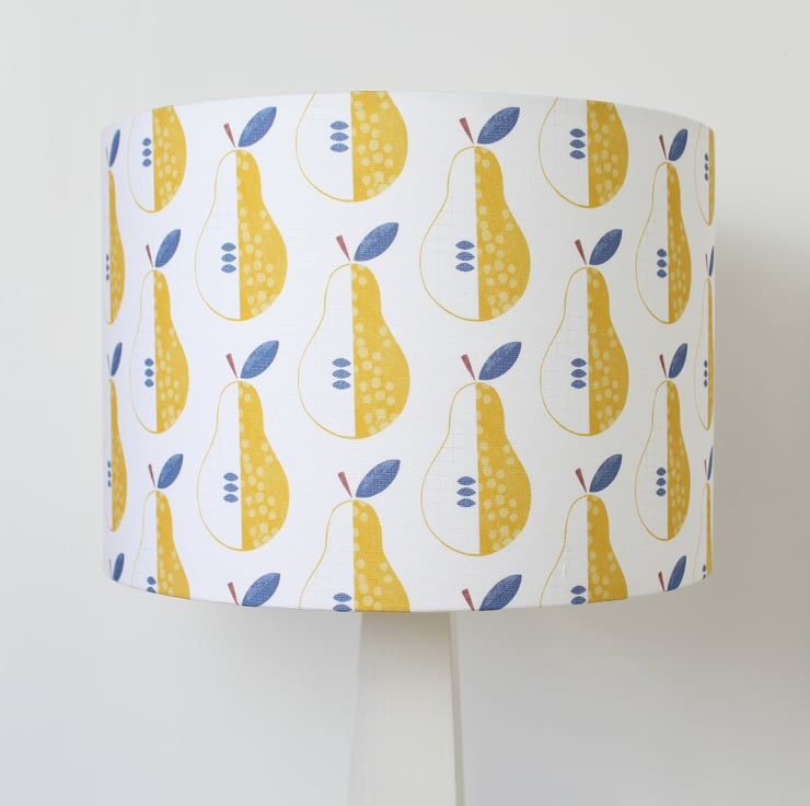 A handmade drum lampshade, made using my Pear print fabric in Yellow