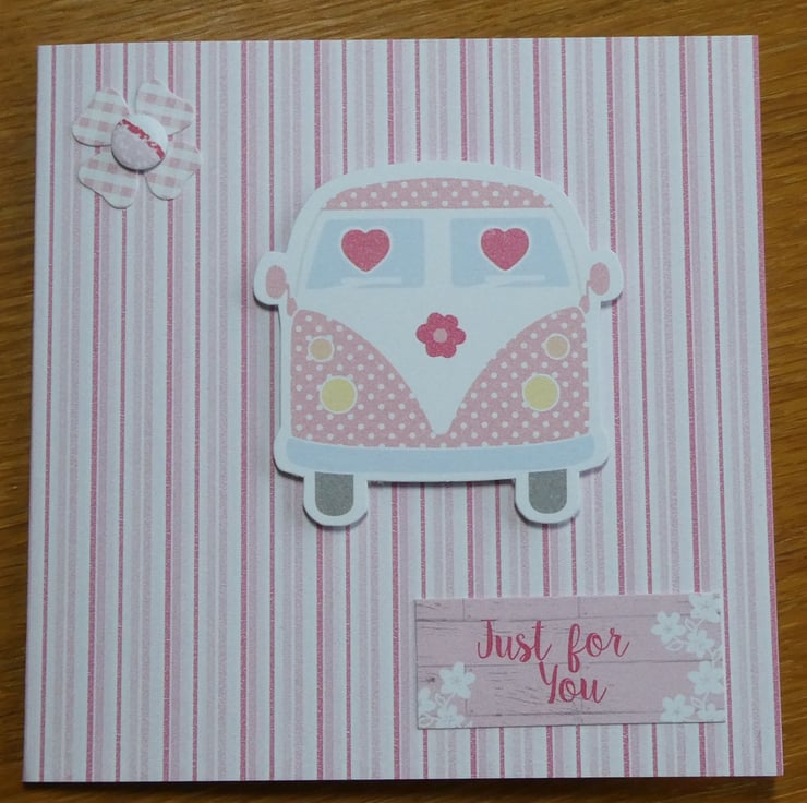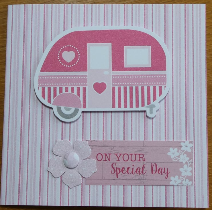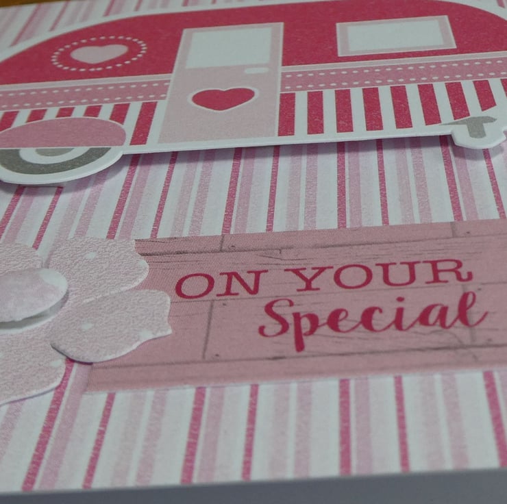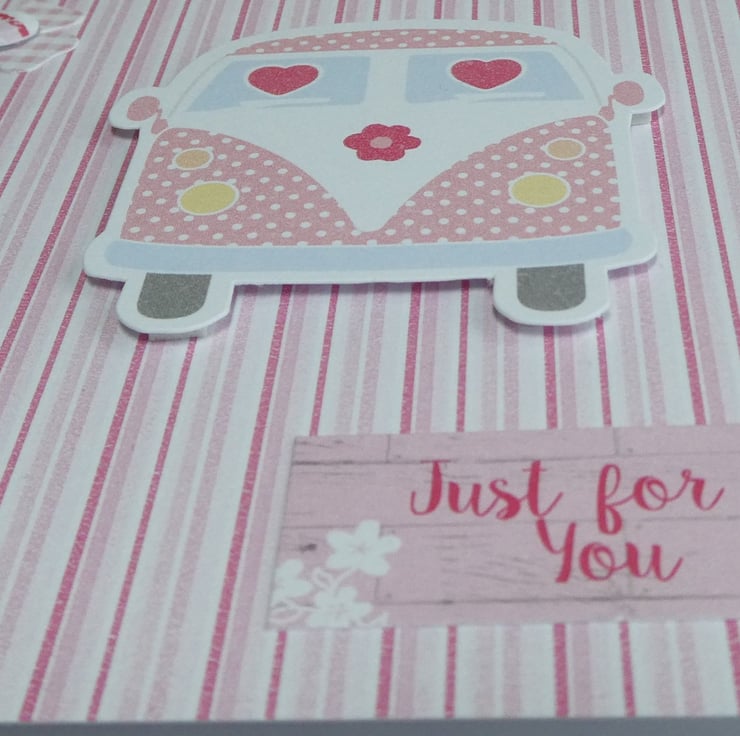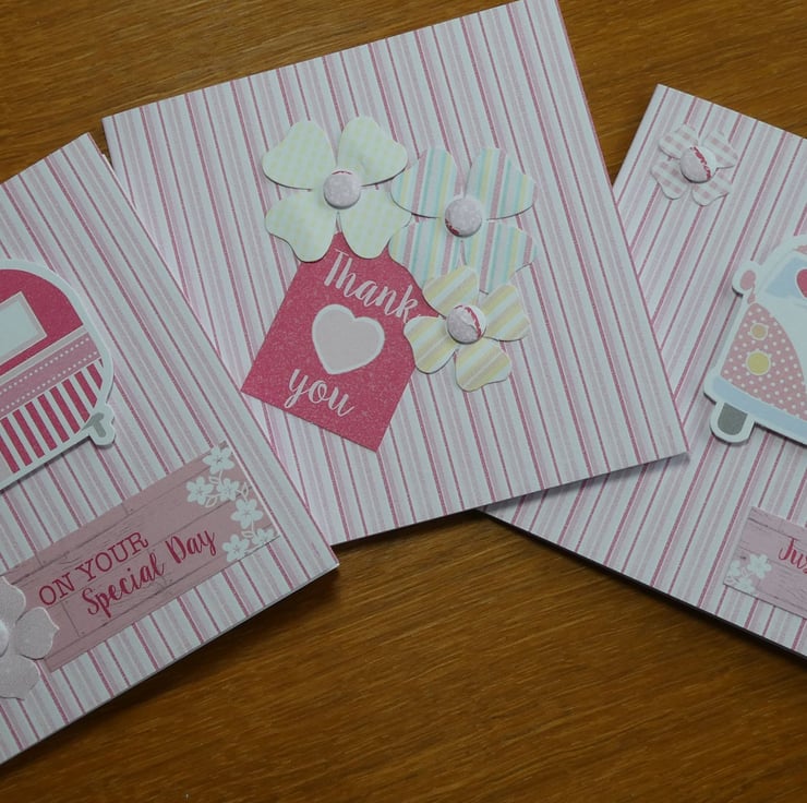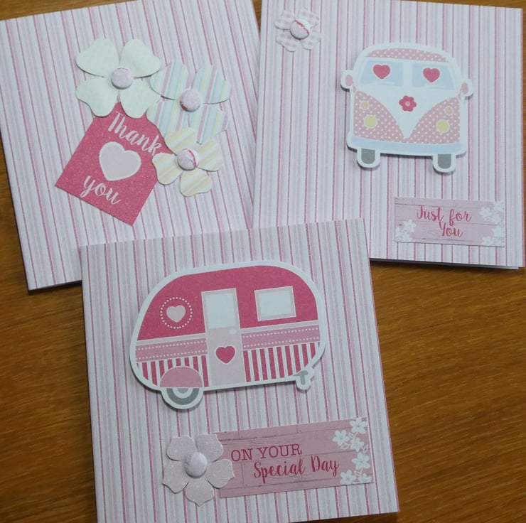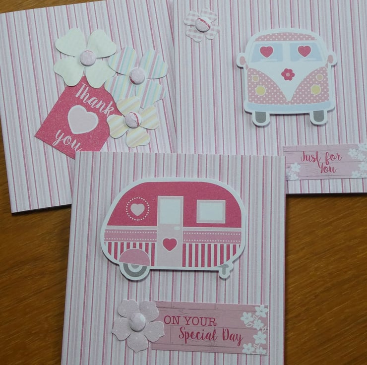 The cards all have a retro feel and have images of an old style caravan, flowers or campervan in shades of pink. lemon and white on a base of striped card in toning shades.